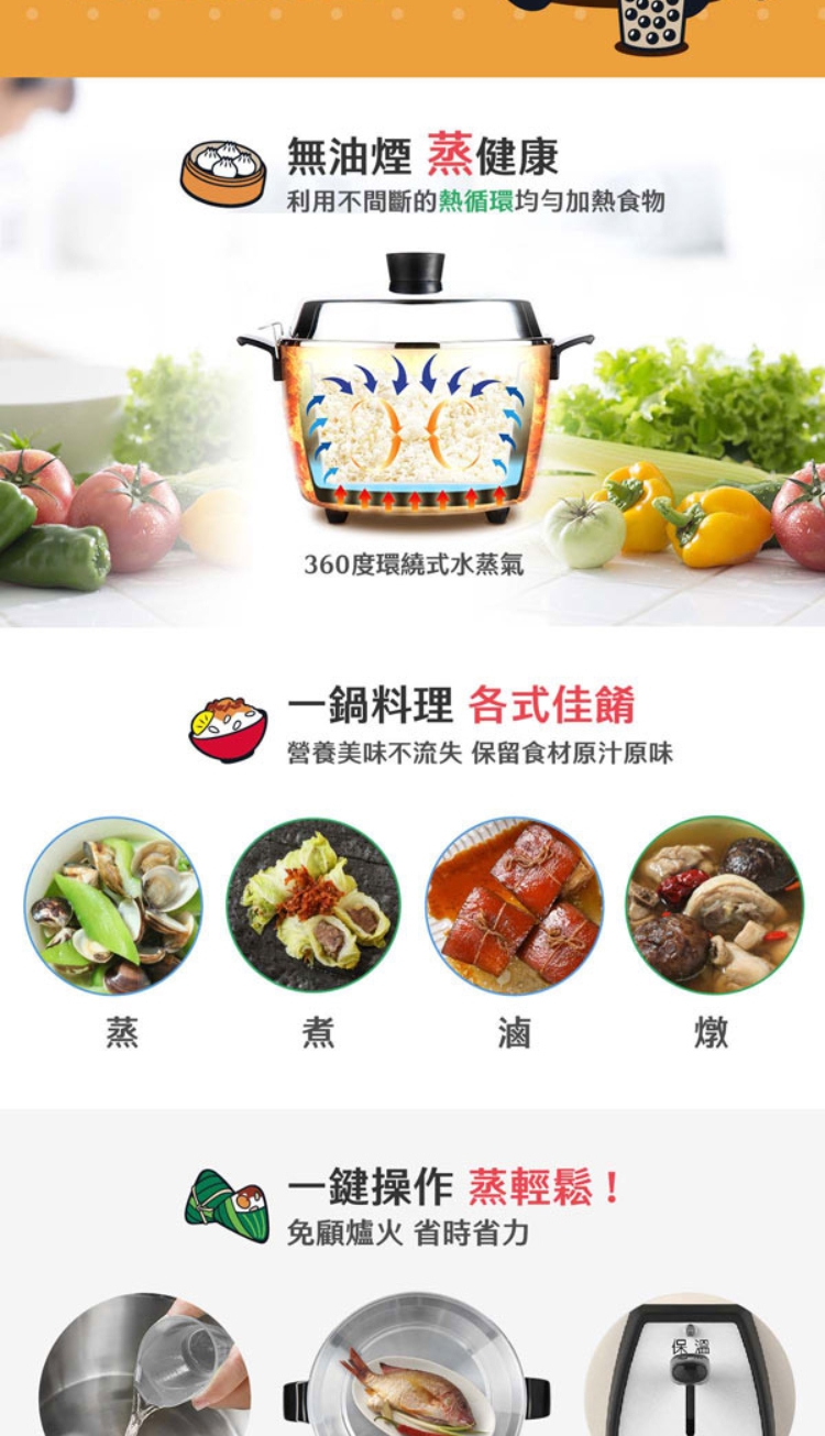 ◆ 多元料理,煮飯/粥、蒸、滷、燉多用途