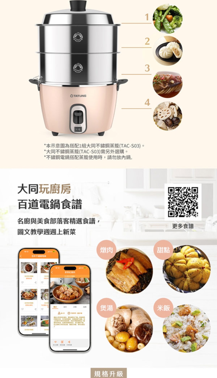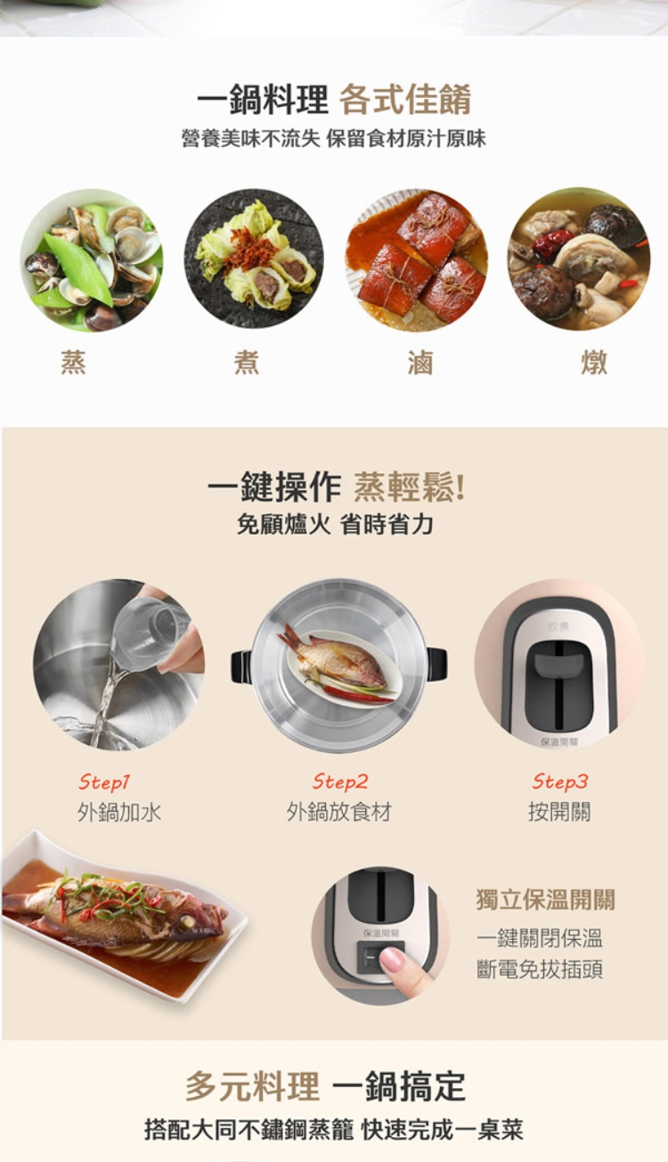 ★ 多元料理,煮飯/粥、蒸、滷、燉多用途