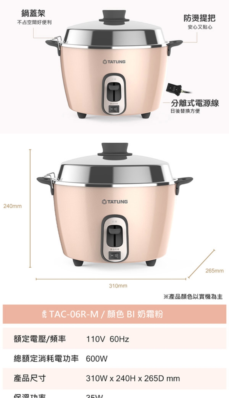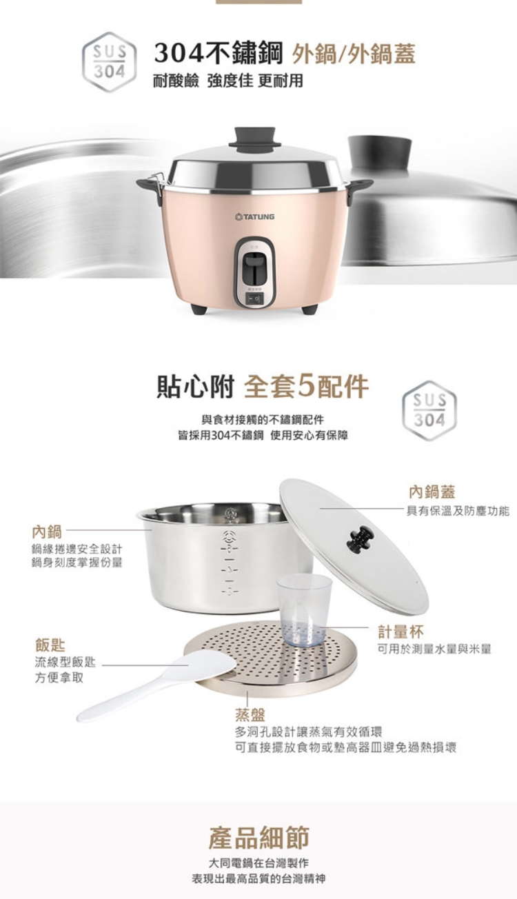 ◎ 配件:量米杯、飯匙、蒸盤、內鍋、內鍋蓋