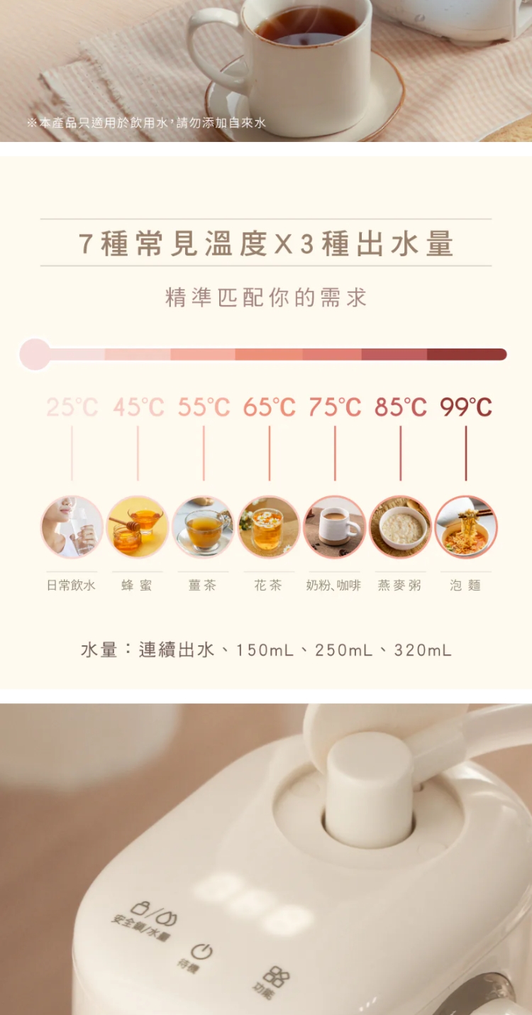 ★ 連續出水+三種水量150mL/250mL/320mL,自由選擇