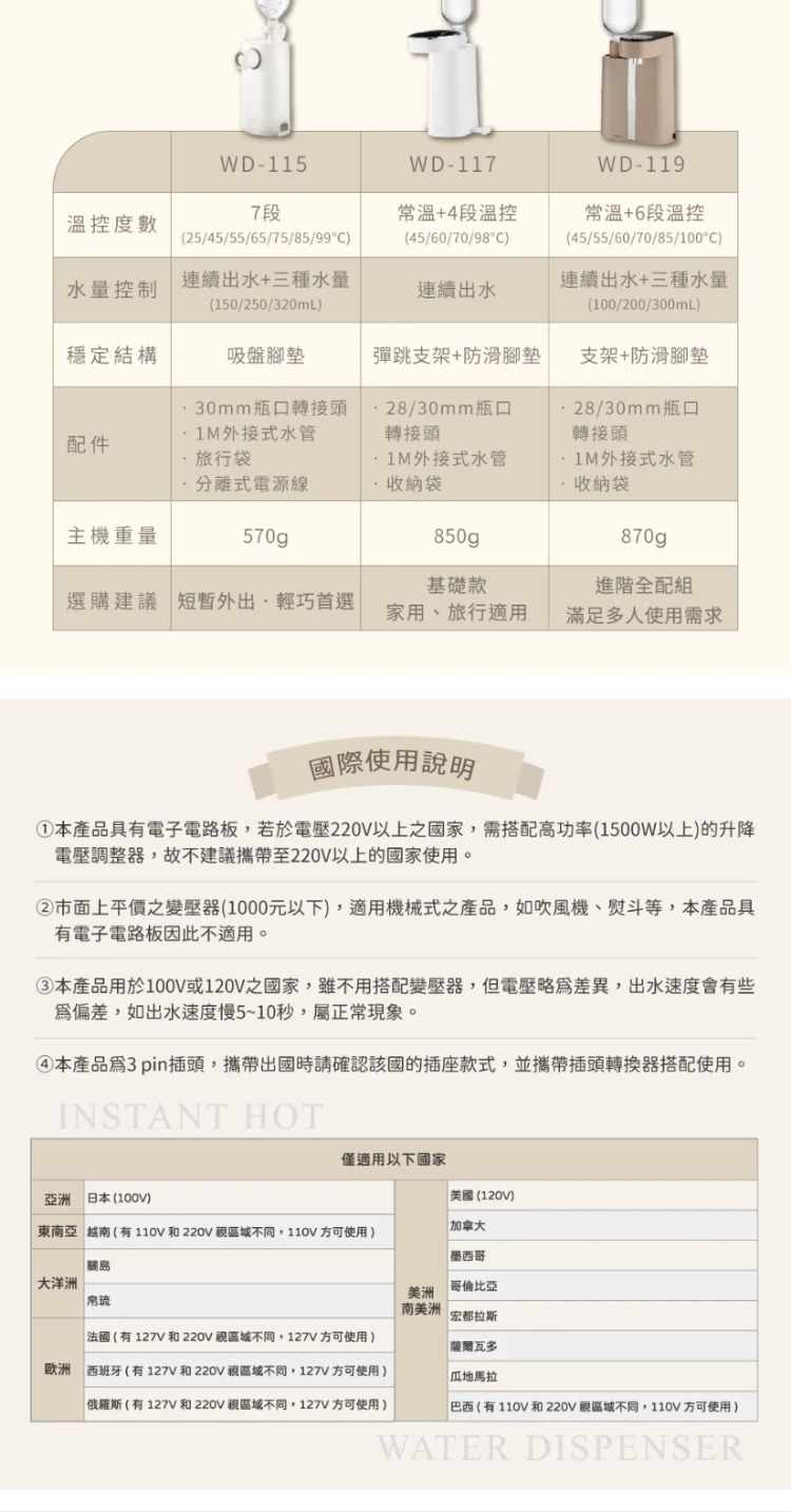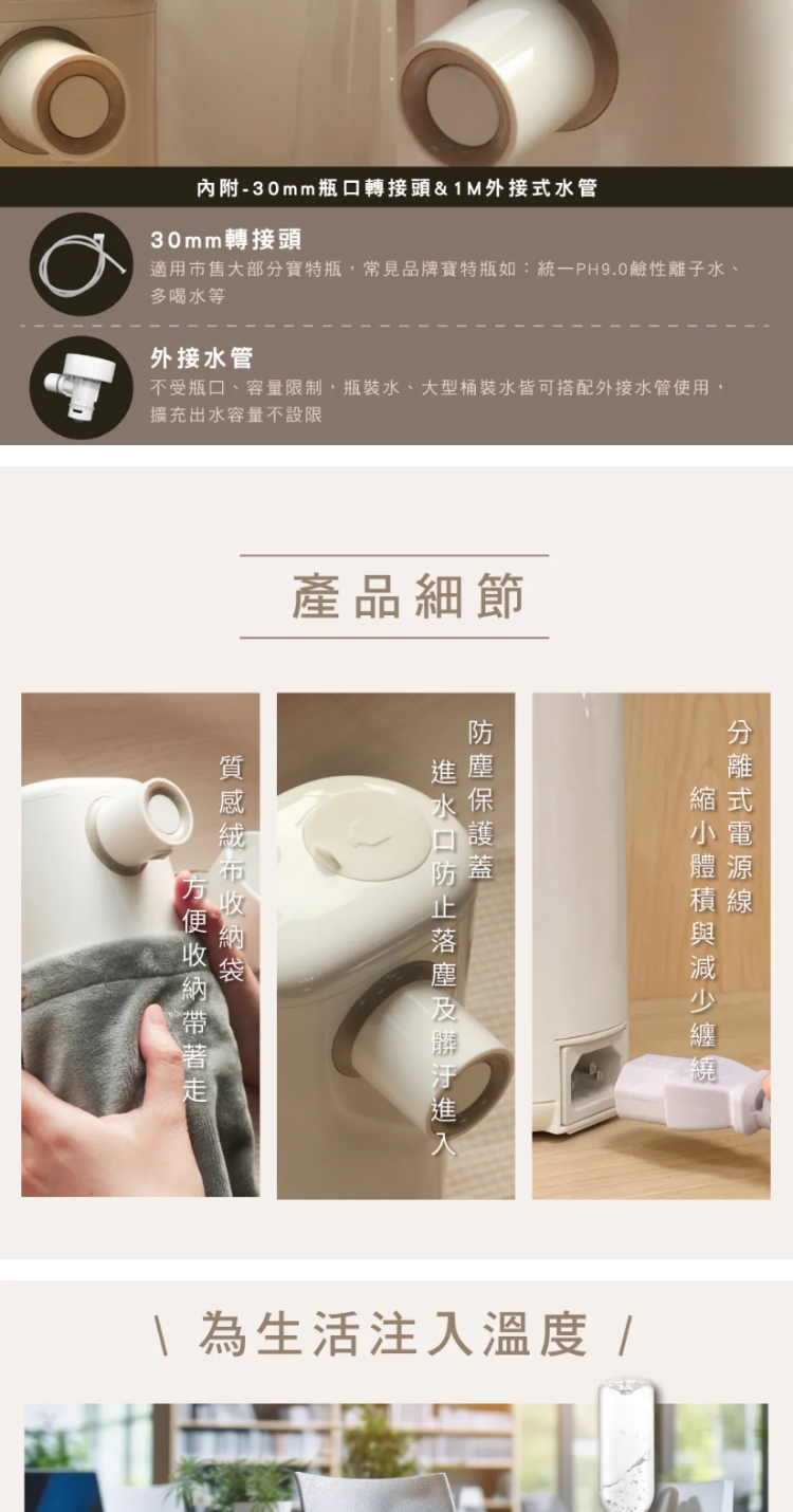 ◎ 配件:30mm瓶口轉接頭、1M外接式水管、分離式電源線、旅行袋