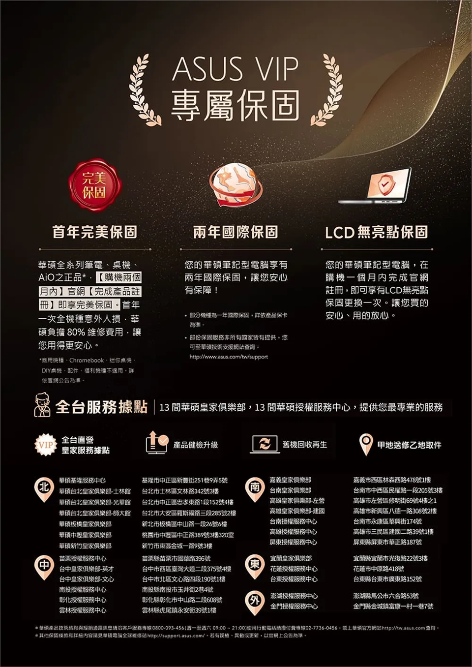 台灣區自2002年2月1日起凡購買華碩筆記型電腦即可享有兩年產品保固服務。