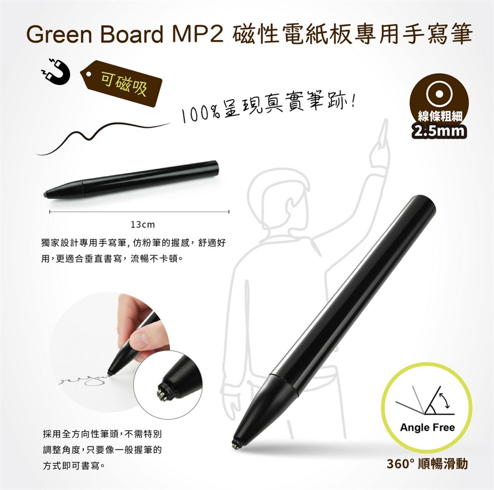 Green Board MP2磁性電紙板專用手寫筆-2.5mm,是獨家設的專用 書寫筆,握感舒適,垂直書寫更順手,平面使用也同樣流暢不卡頓。 採用全方向性筆頭,不需特別調整角度,只要像一般握筆的方式即可書寫。 在垂直板面或平放桌面上,都能360°順暢滑動,如同真筆書寫般自然、無卡頓。