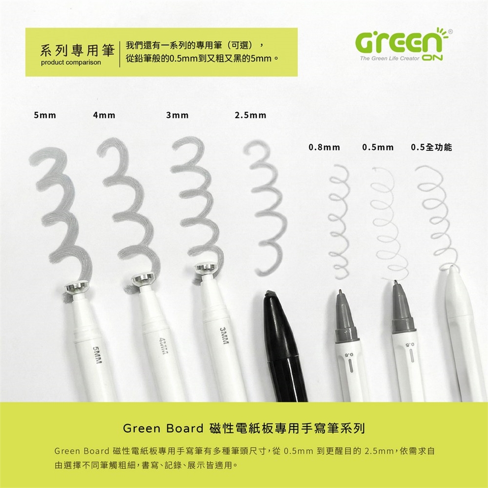 Green Board 磁性電紙板專用手寫筆有多種筆頭尺寸,從鉛筆般的0.5mm 到又粗又黑的5mm,依需求自由選擇不同筆觸粗細,書寫、記錄、展示皆適用。