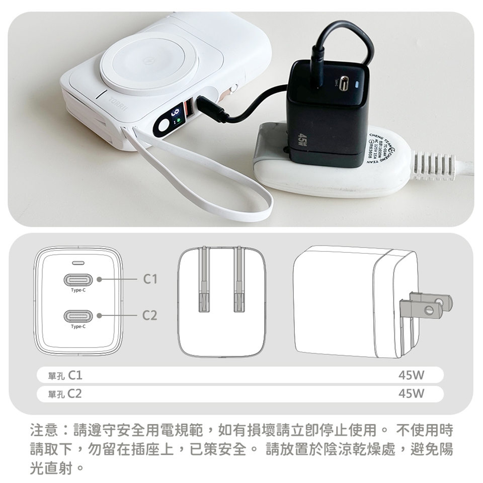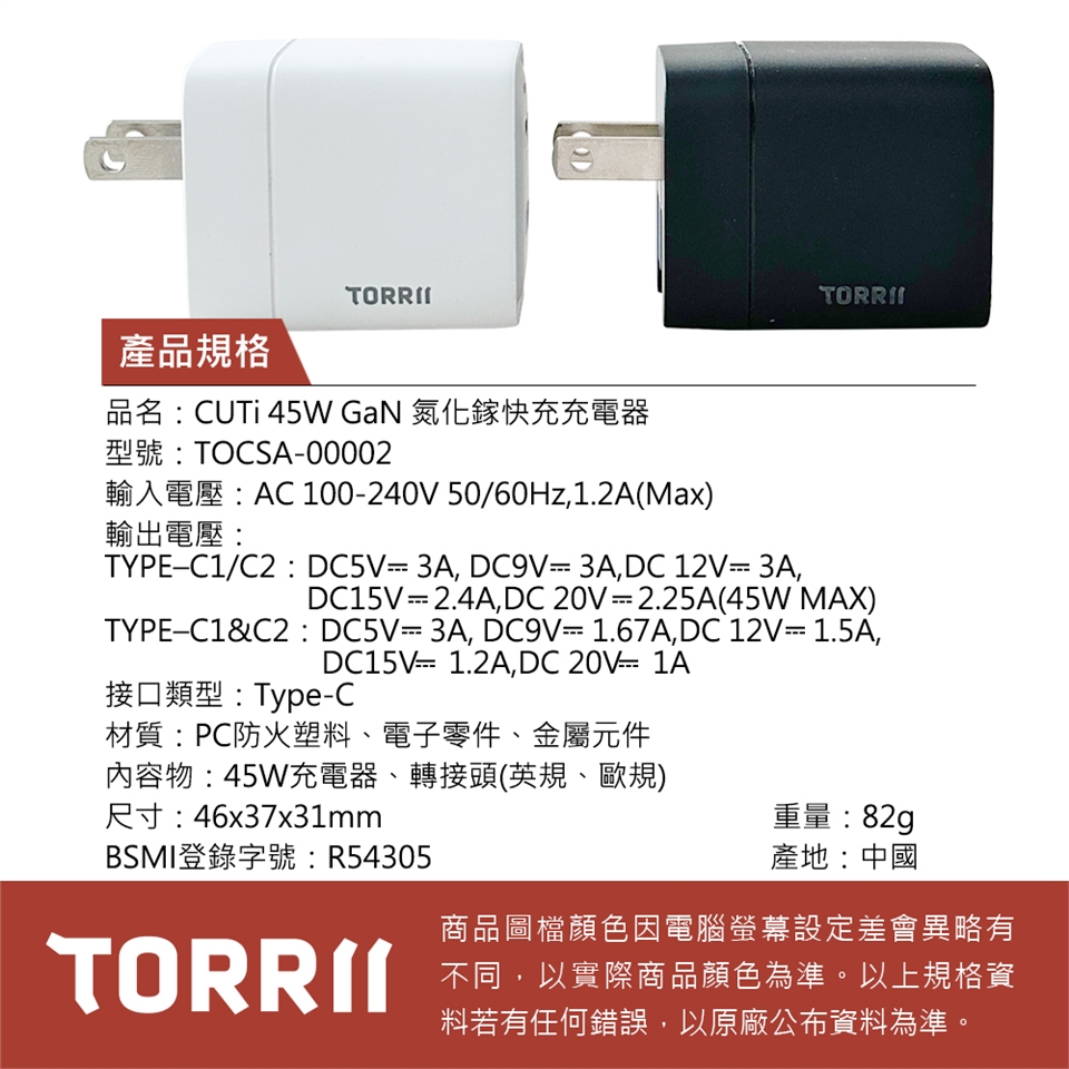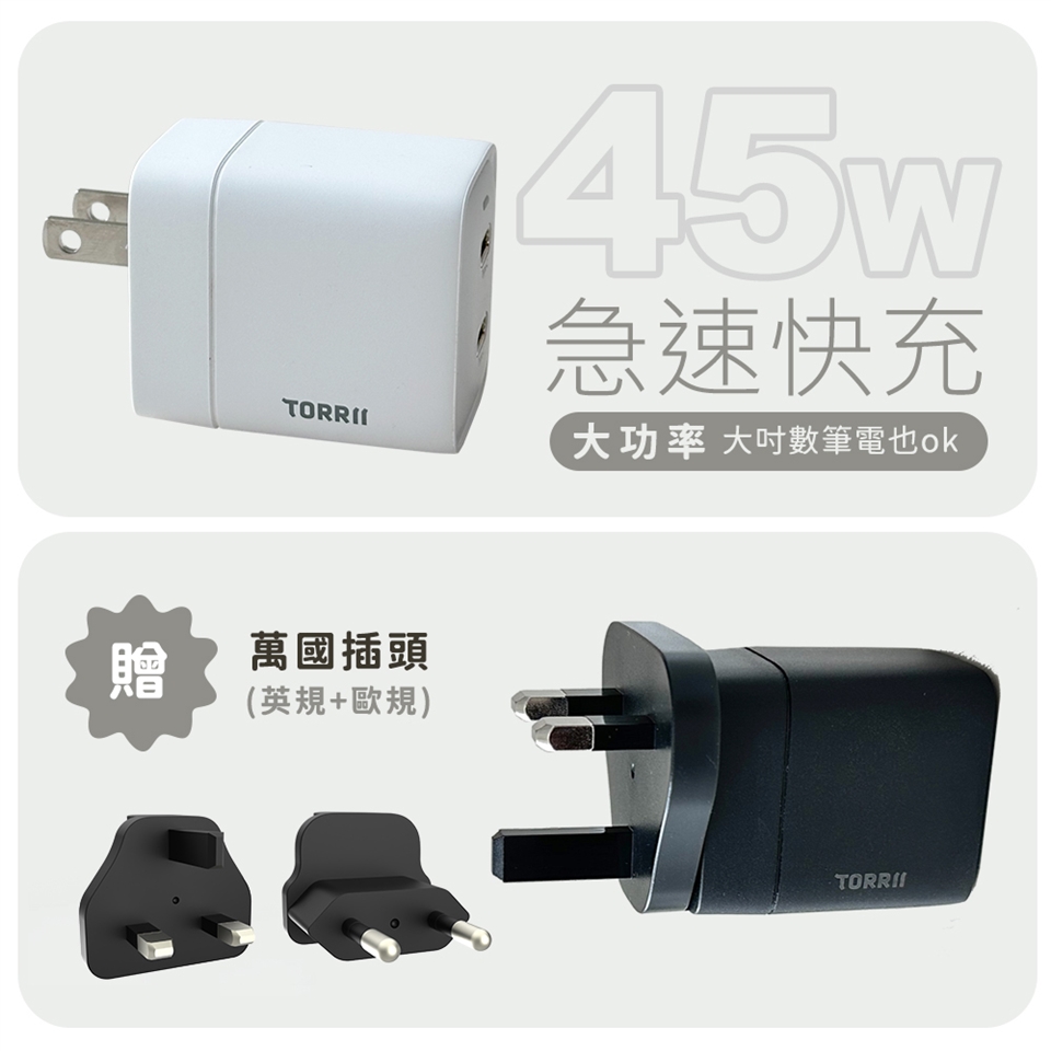 內容物:45W充電器、轉接頭(英規、歐規)