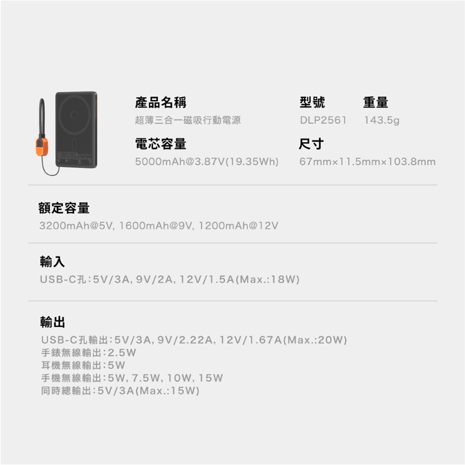 USB-C輸出:5V-3A,9V-2.22A,12V-1.67A