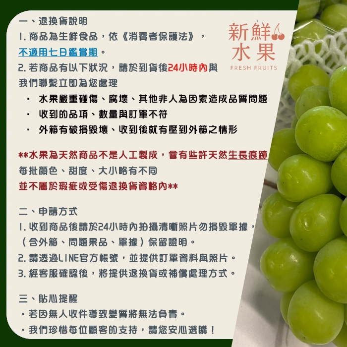 1. 本商品為生鮮食品,依《消費者保護法》規定,不適用七日鑑賞期。