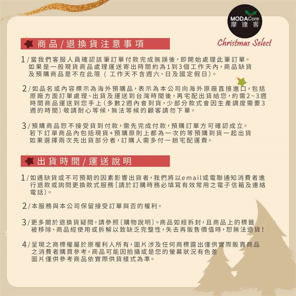 ※ 如遇缺貨或不可預期因素影響,未能出貨者,我們將會以 email 或電話連絡通知消費者。[請於訂購時您的資料務必填寫有效常用之電子信箱及連絡電話]