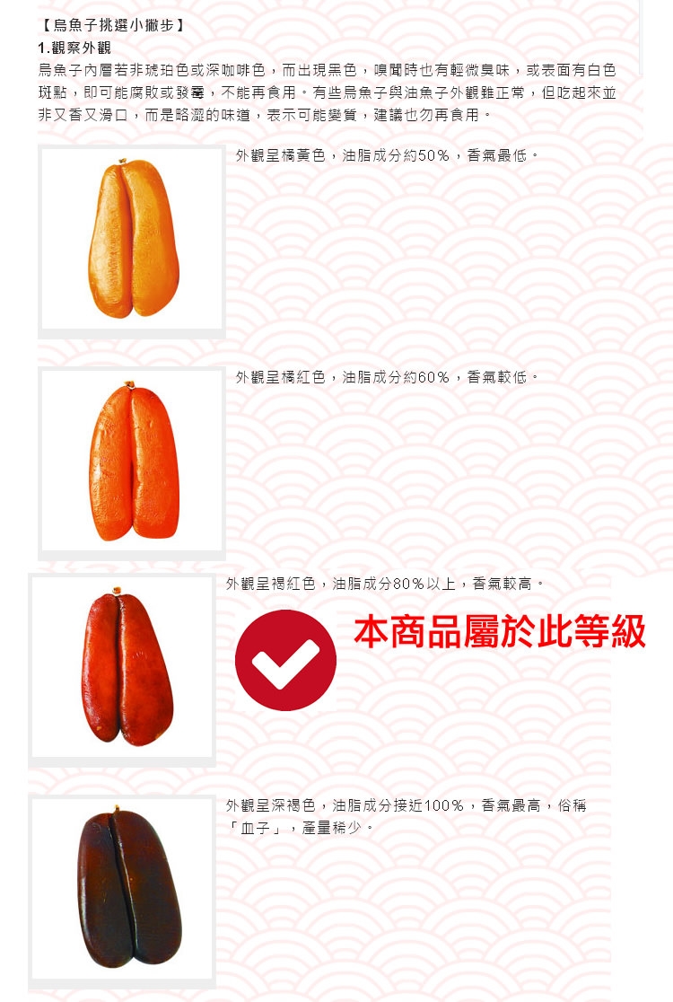 注意事項 : 本商品為天然野生烏魚子切片,形狀不均有血絲為正常現象喔。
