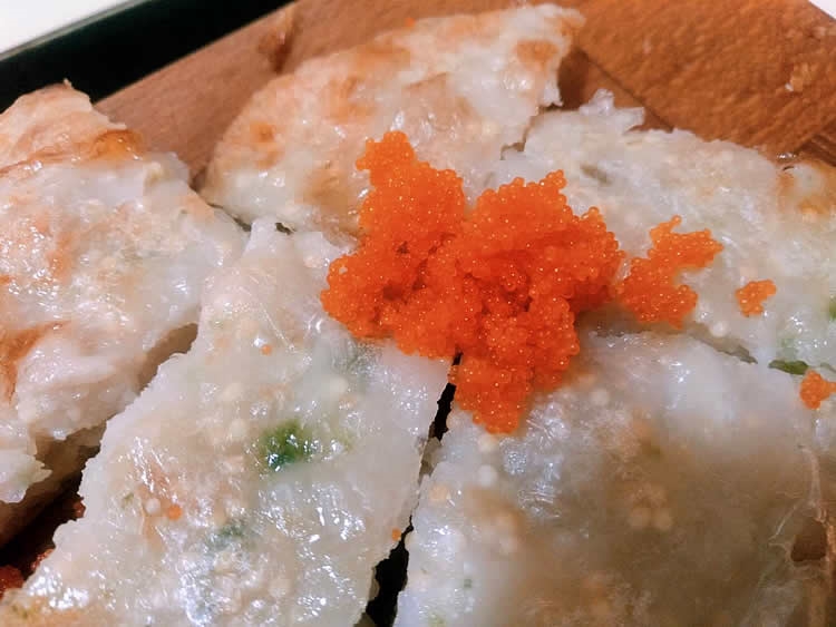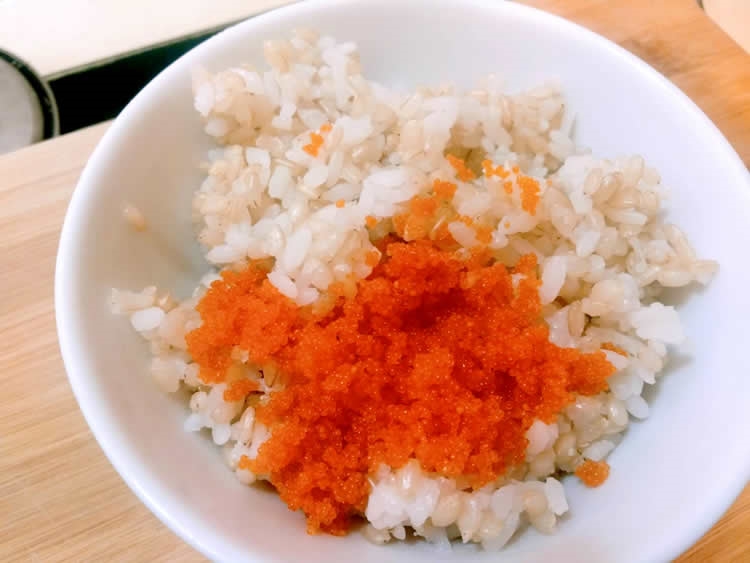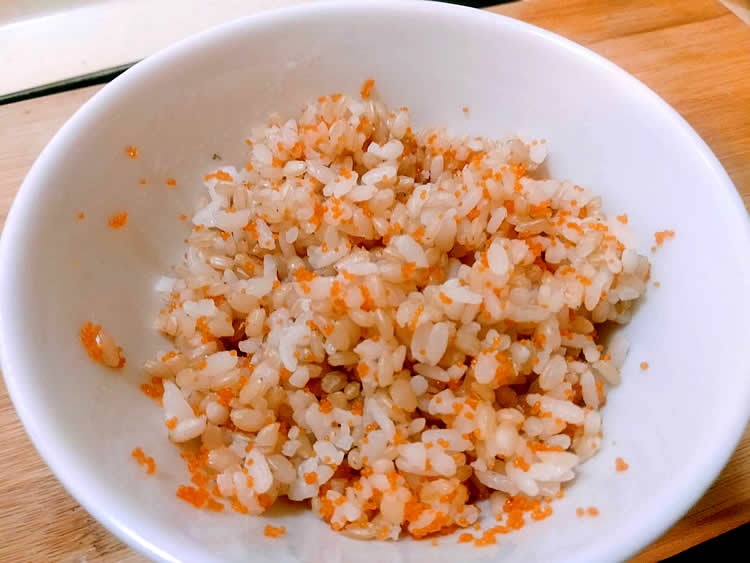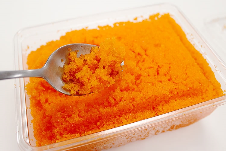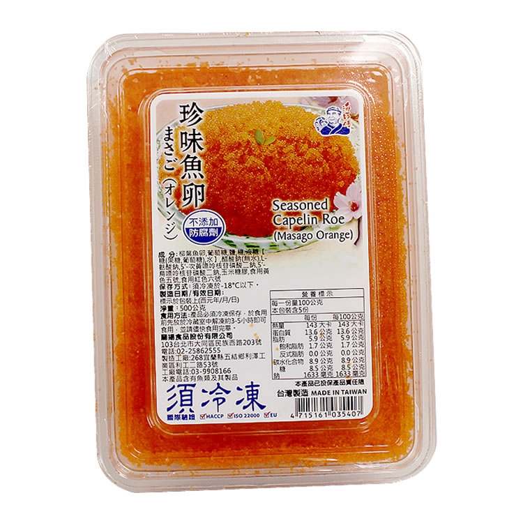 成分 : 柳葉魚卵、葡萄糖、鹽、水、無水醋酸鈉、L-麩酸鈉、5'–次黃嘌呤核苷磷酸二鈉、5 '–鳥嘌呤核苷磷酸二鈉、玉米糖膠、食用黃色五號、食用紅色六號。