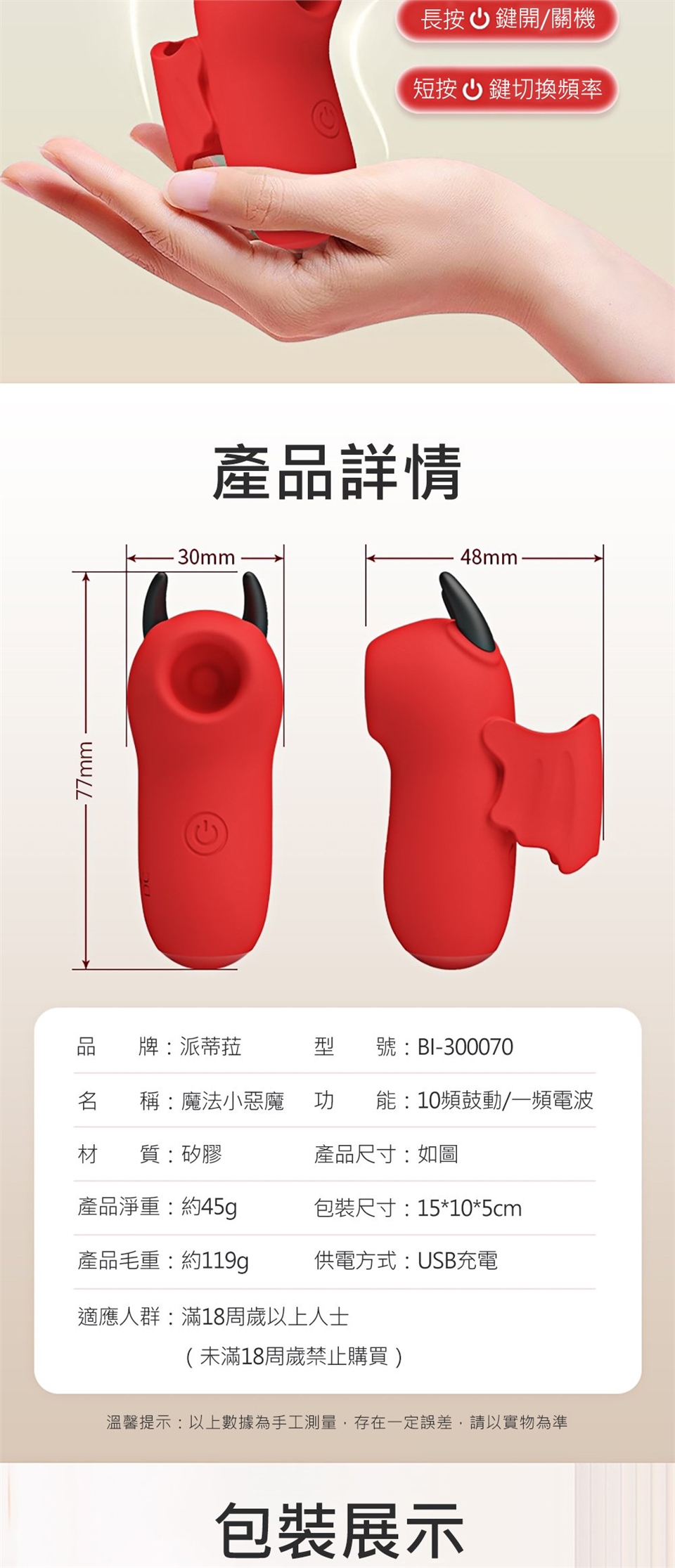 使用說明:長按2秒,開/關機;短按,切換頻率。