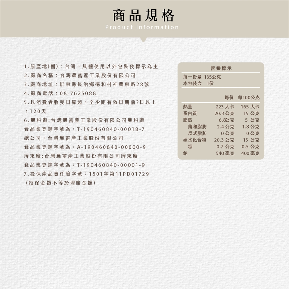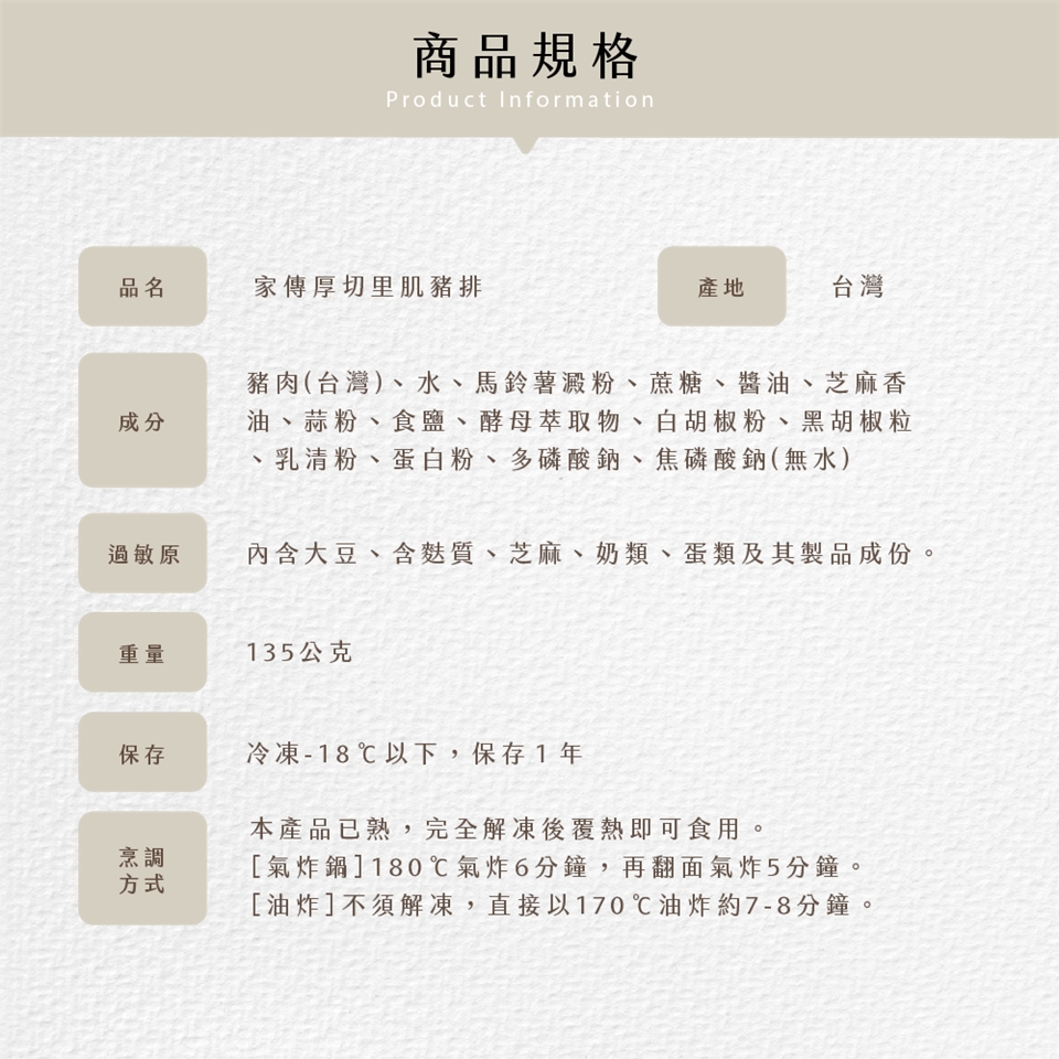 過敏原:內含大豆、含麩質、芝麻、奶類、蛋類及其製品成份