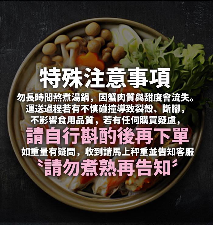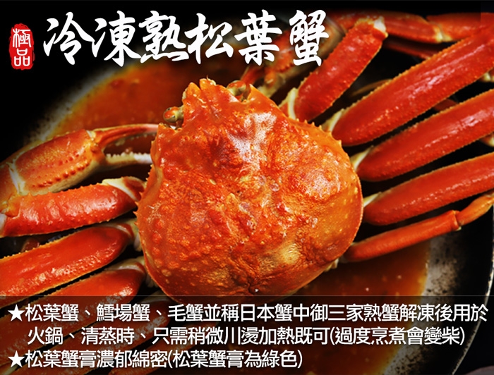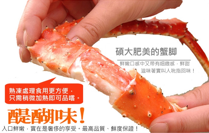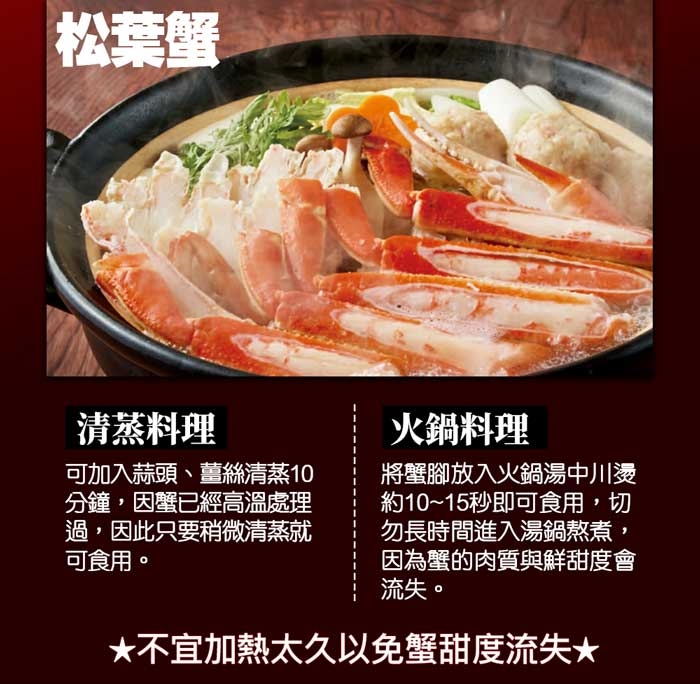 2. 帝王蟹火鍋料理:將帝王蟹腳放入火鍋湯中川燙約10~15秒既可食用,切勿長時間進入湯鍋熬煮,因為蟹的肉質與甜度會流失。
