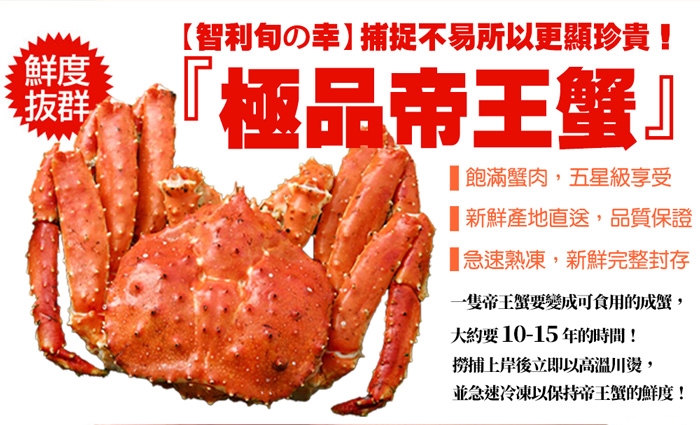 1. 帝王蟹清蒸料理:將帝王蟹分解後,可加入蒜頭、薑絲清蒸10分鐘,因智利帝王蟹以經高溫處理過,因此只要稍微清蒸就可食用。