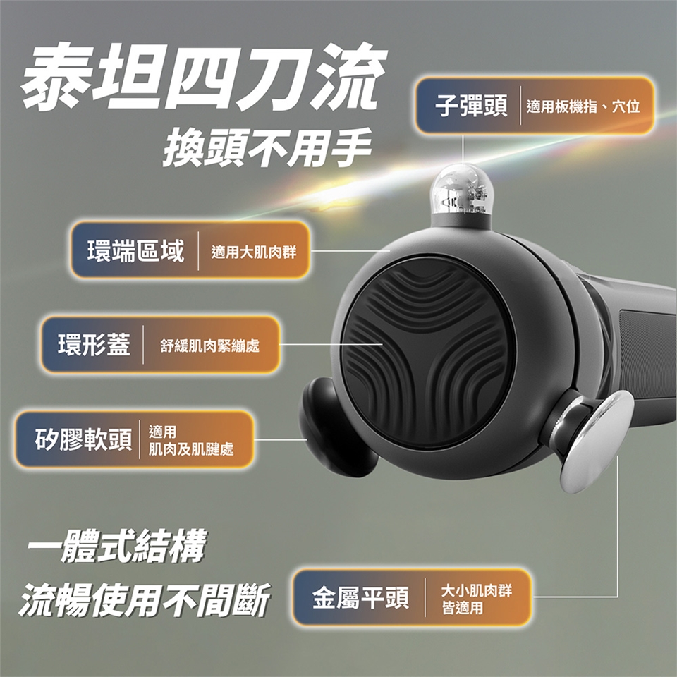 ● 矽膠頭:柔和觸感,適用於肌腱與敏感肌肉群