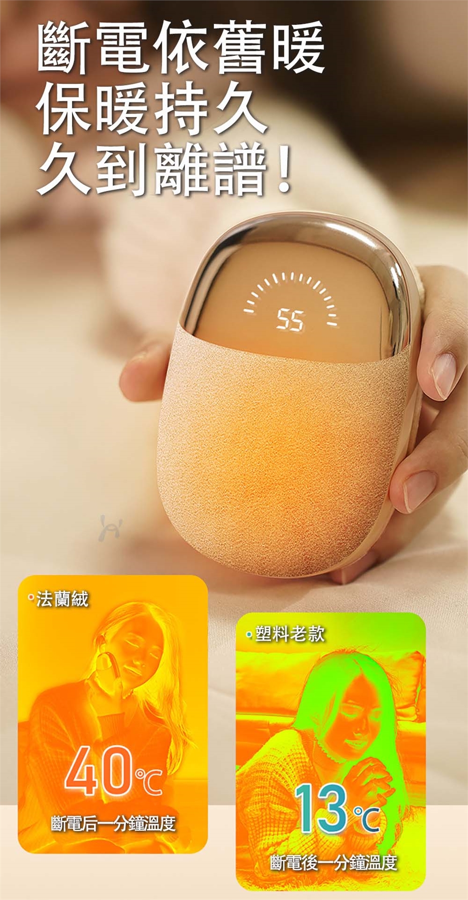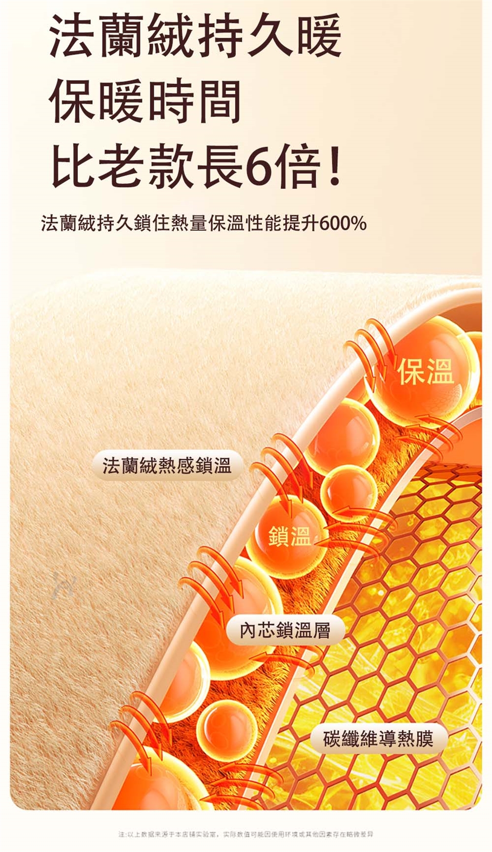 🔒法蘭絨 + 內芯鎖溫層:保溫力提升 6 倍,斷電後一分鐘還能維持 40℃