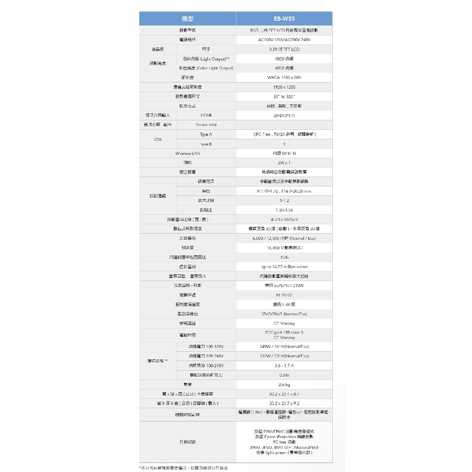 昌運監視器 EPSON 愛普生 EB-W55 高亮彩商用投影機 WXGA 解析度 30.2*23.4*8.7 cm 2.6kg 25900