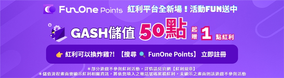 儲值 GASH 點數,不只能玩遊戲,還能同時累積紅利!只要在儲值畫面看到「累積紅利」說明,並輸入台灣手機門號完成儲值,即可獲得 FunOne Points 紅利點數。🎁 累積之紅利可至 FunOne Points 平台兌換咖啡、炸雞、點數卡等超值好禮!👉 搜尋【FunOne Points】兌換你的紅利回饋!