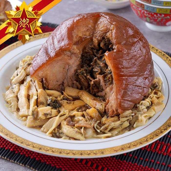 客家福封燜元蹄:紅燒元蹄,膠質豐厚;肉質軟糯,醬香入味。圓滿飽滿,象徵福祿雙全,闔家共享。
