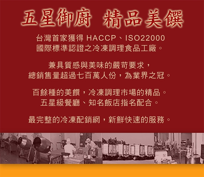 ◎獲得ISO 22000及HACCP國際標準認證之冷凍調理食品工廠。