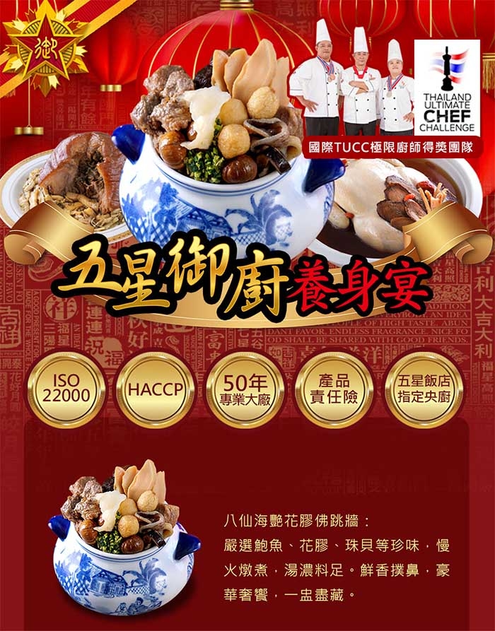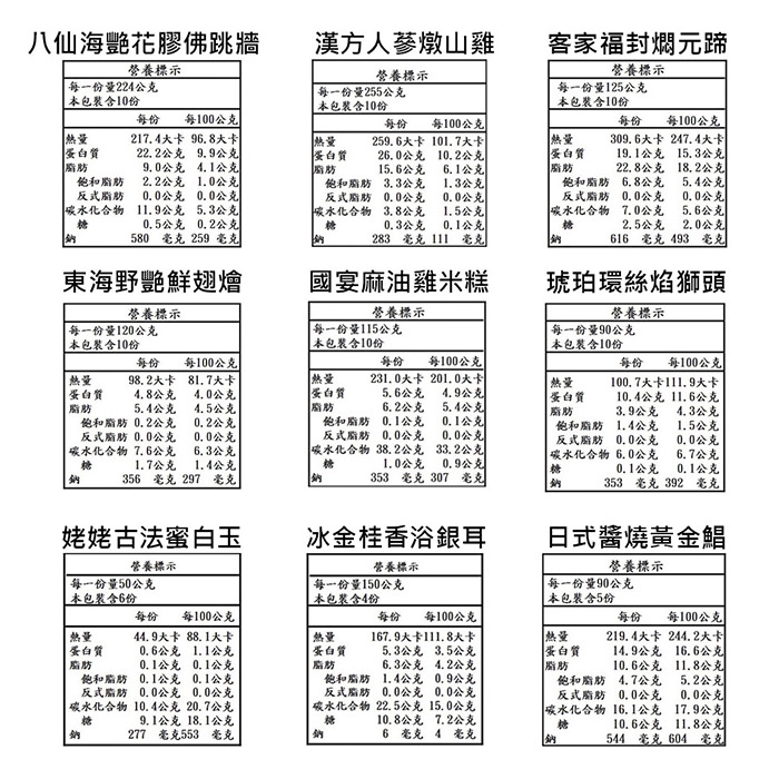 八仙海艷花膠佛跳牆:湯包:高湯{水、豬骨(台灣)、雞骨、豬皮(台灣)、油蔥酥、蒜、蔥、扁魚、蝦皮}、蠔油{水、糖、鹽、L-麩酸鈉、乙醯化磷酸二澱粉、甜麵醬(麵粉、水、鹽、糖)、蠔萃取物(蠔、水、鹽)、香料(蝦粉、魚粉)、水解蛋白(水解玉米蛋白、麥芽糊精、鹽、葵花籽油)、焦糖色素、魚露(鯷魚、鹽)、調味劑(5'-次黃嘌呤核苷磷酸二鈉、5'-鳥嘌呤核苷磷酸二鈉)、檸檬酸、蠔乾汁 (水、蠔乾、鹽)、已二烯酸鉀(防腐劑)、玉米糖膠、甜菊糖(甜味劑)}、烏醋、雞粉{鹽、麥芽糊精、L-麩酸鈉、糖、玉米澱粉、香料、雞肉粉、雞油、酵母萃取物、棕櫚油、硬質棕櫚油、5'-次黃嘌呤核苷磷酸二鈉、5'-鳥嘌呤核苷磷酸二鈉、白胡椒}、醬油{水、非基因改造脫脂黃豆片、小麥、食鹽、轉化液糖(蔗糖、水)、酒 精、著色劑(焦糖色素)、酵母抽出物、甜味劑(甘草萃(含糊精、檸檬酸鈉))、紅麴色素(含酒 精)、調味劑(DL-蘋果酸)}、干貝調味粉{調味劑(L-麩酸鈉、胺基乙酸、琥珀酸二鈉、5'-次黃嘌呤核苷磷酸二鈉、5'-鳥嘌呤核苷磷酸二鈉)、食鹽、糖、玉米澱粉、干貝粉、酵母抽出物、扇貝抽出物、麥芽糊精}、白胡椒粉。鮑魚珠貝包:豬肉(台灣、加拿大)、雞肉、醬汁【水、蠔油{水、糖、鹽、L-麩酸鈉、乙醯化磷酸二澱粉、甜麵醬(麵粉、水、鹽、糖)、蠔萃取物(蠔、水、鹽)、香料(蝦粉、魚粉)、水解蛋白(水解玉米蛋白、麥芽糊精、鹽、葵花籽油)、焦糖色素、魚露(鯷魚、鹽)、調味劑(5'-次黃嘌呤核苷磷酸二鈉、5'-鳥嘌呤核苷磷酸二鈉)、檸檬酸、蠔乾汁 (水、蠔乾、鹽)、已二烯酸鉀(防腐劑)、玉米糖膠、甜菊糖(甜味劑)}、烏醋、雞粉{鹽、麥芽糊精、L-麩酸鈉、糖、玉米澱粉、香料、雞肉粉、雞油、酵母萃取物、棕櫚油、硬質棕櫚油、5'-次黃嘌呤核苷磷酸二鈉、5'-鳥嘌呤核苷磷酸二鈉、白胡椒}、醬油、干貝調味粉{調味劑(L-麩酸鈉、胺基乙酸、琥珀酸二鈉、5'-次黃嘌呤核苷磷酸二鈉、5'-鳥嘌呤核苷磷酸二鈉)、食鹽、糖、玉米澱粉、干貝粉、酵母抽出物、扇貝抽出物、麥芽糊精}、白胡椒粉】、鮑螺、魚皮、地瓜粉、大豆油、醬油{水、非基因改造脫脂黃豆片、小麥、食鹽、轉化液糖(蔗糖、水)、酒精、著色劑(焦糖色素)、酵母抽出物、甜味劑(甘草萃(含糊精、檸檬酸鈉))、紅麴色素(含酒精)、調味劑(DL-蘋果酸)}、珠貝、多磷素B(多磷酸鈉、焦磷酸鈉)、L-麩酸鈉、五香粉(小茴、肉桂、八角、丁香、花椒)、白胡椒粉、天然香料。芋頭栗子包:芋頭、鳥蛋、栗子、蒜頭、香菇、大豆油。白菜包:白菜、水。花膠包:花膠、水。