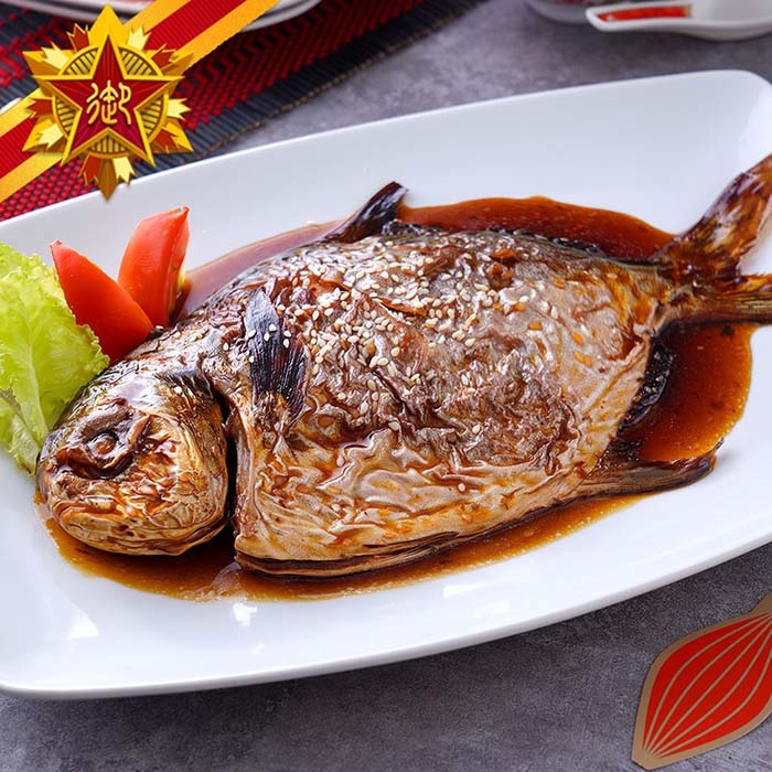 日式醬燒黃金鯧:蒲燒醬汁,刷裹鯧魚;外皮焦香,肉質細緻。金黃色澤,年節吉祥,象徵招財進寶。本產品含有魚刺食用時請小心。