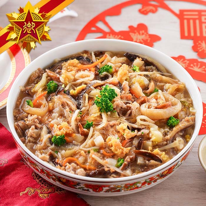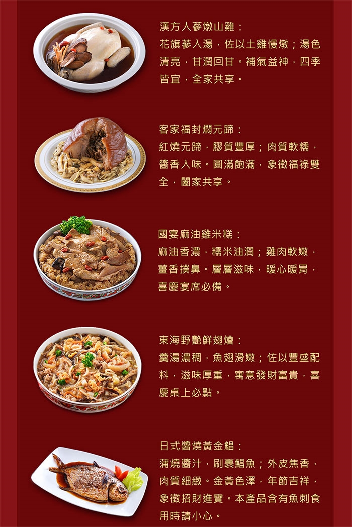 客家福封燜元蹄:福菜大封:豬蹄膀(台灣)、梅干菜、蒜油(大豆油、蒜頭、醬油、蝦米、蔗糖、L-麩酸鈉、鮮味露(水、食鹽、小麥、糖、焦糖色素、醋酸、香料、調味劑(5'-鳥嘌呤核苷磷酸二鈉、5'-次黃嘌呤核苷磷酸二鈉)、葡萄糖、聚山梨醇酐脂肪酸脂八十)、滷汁(水、醬油膏(水、非基因改造黃豆片胺基酸液、純釀造生醬油(非基因改造高蛋白豆片、小麥、食鹽)、轉化液糖(蔗糖、水)、黏稠劑(乙醯化己二酸二澱粉)、糯米、防 腐 劑(己二烯酸鉀)、甜味劑(甘草酸鈉)、酵母抽出物、食鹽、調味劑(DL-蘋果酸))、麥芽糖、醬油、冰糖、米 酒、天然香料、L-麩酸鈉、鮮雞高湯〔水、鹽、雞肉萃取物(含鹽)、L-麩酸鈉、糖、雞油、乙醯化磷酸二澱粉、香料、調味劑(5'-次黃嘌呤核苷磷酸二鈉、5'-鳥嘌呤核苷磷酸二鈉)、明膠、玉米糖膠、β-胡蘿蔔素(麥芽糊精、辛烯基丁二酸鈉澱粉、葵花籽油、蔗糖、抗氧化劑(L-抗壞血酸鈉、維生素C、維生素E)、β-胡蘿蔔素)〕、蒜頭、素蠔油〔水、轉化液糖(蔗糖、水)、非基因改造脫脂大豆片、小麥、食鹽、黏稠劑(玉米糖膠、乙醯化己二酸二澱粉)、酵母抽出物、苯甲酸鈉(防腐劑)、香菇粉〕、老抽(水、黃豆、小麥麵粉、鹽、糖)、齋湯(水、醬油、鹽、L-麩酸鈉、糖、香料、棕梠油、乙醯化己二酸二澱粉、調味劑(5'-鳥嘌呤核苷磷酸二鈉、5-次黃嘌呤核苷磷酸二鈉)、玉米麥芽糊精、玉米糖膠)、紅麴米、蔗糖、多磷素B(多磷酸鈉、焦磷酸鈉)、白胡椒粉。筍絲包:筍乾、卜菜、高湯(水、雞骨、豬皮(台灣)、紅蔥酥、蒜頭、青蔥)、雞油、豬油(台灣)、豚骨白醬(水、豬骨高湯(豬骨萃取物、豬骨油、水、鹽、關華豆膠)、L-麩酸鈉、糖、鹽、麥芽糊精、樹薯澱粉、蒜粉、薑粉、葡萄糖、白胡椒粉、調味劑(5'-次黃嘌呤核苷磷酸二鈉、5'-鳥嘌呤核苷磷酸二鈉)、玉米糖膠、己二烯酸鉀(防腐劑)、維生素E(抗氧化劑)、香料))、火腿汁({水、鹽、L-麩酸鈉、糖、火腿油[豬油(西班牙)、火腿油(中國)、抗氧化劑(維生素E)]、香料、羥丙基磷酸二澱粉、火腿萃取物、焦糖色素、酵母萃取物、調味劑(5'-次黃嘌呤核苷磷酸二鈉、5'-鳥嘌呤核苷磷酸二鈉)、玉米糖膠、β-胡蘿蔔素[麥芽糊精、辛烯基丁二酸鈉澱粉、葵花籽油、抗氧化劑(L-抗壞血酸鈉、維生素C、維生素E)、β-胡蘿蔔})、L-麩酸鈉、鮮雞汁(水、鹽、味精、白砂糖、食品添加劑(增稠劑、增味劑、著色劑、酸度調節劑)、雞骨肉萃取物、雞油、食用香精、酵母萃取物、麥芽糊精、小麥、食用葡萄醣、植物油)、冰糖、食鹽、雞粉(鹽、麥芽糊精、L-麩酸鈉、糖、玉米澱粉、香料、雞肉粉、雞油、酵母萃取物、棕櫚油、硬質棕櫚油、5'-次黃嘌呤核苷磷酸二鈉、5'-鳥嘌呤核苷磷酸二鈉、白胡椒)、白胡椒粉。