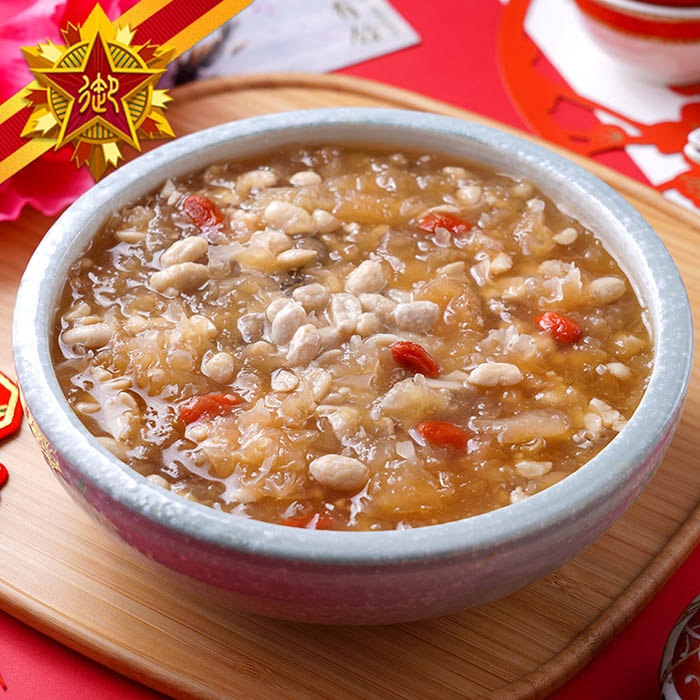 冰金桂香浴銀耳:這道湯品以香濃的銀耳湯為基底,細緻滑順,搭配清脆的花生片與甘甜的枸杞,滋味層次豐富,口感更是獨特。
