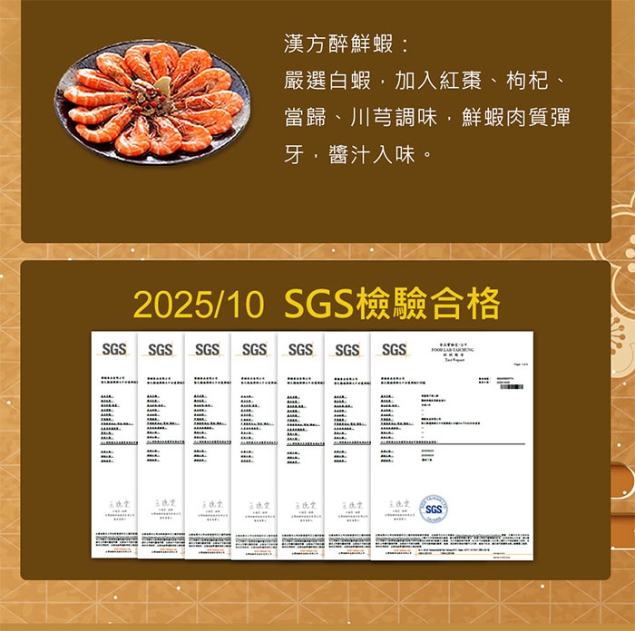 漢方醉鮮蝦:自然解凍並隔水加熱或蒸、炊至產品熟透即可。