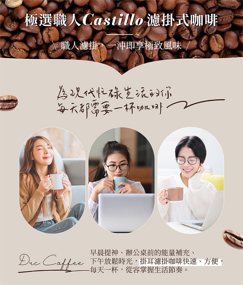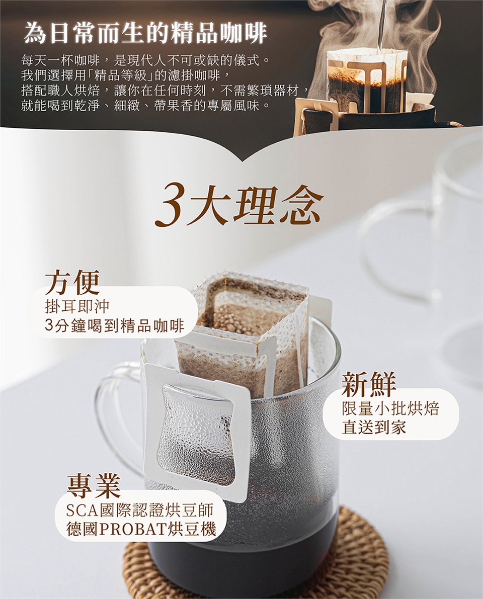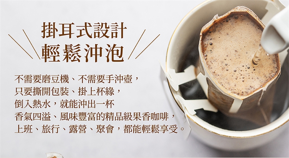5. 掛耳式設計,只要撕開包裝、掛上杯緣,倒入熱水,就能沖出一杯香氣四溢、風味豐富的精品級果香咖啡。