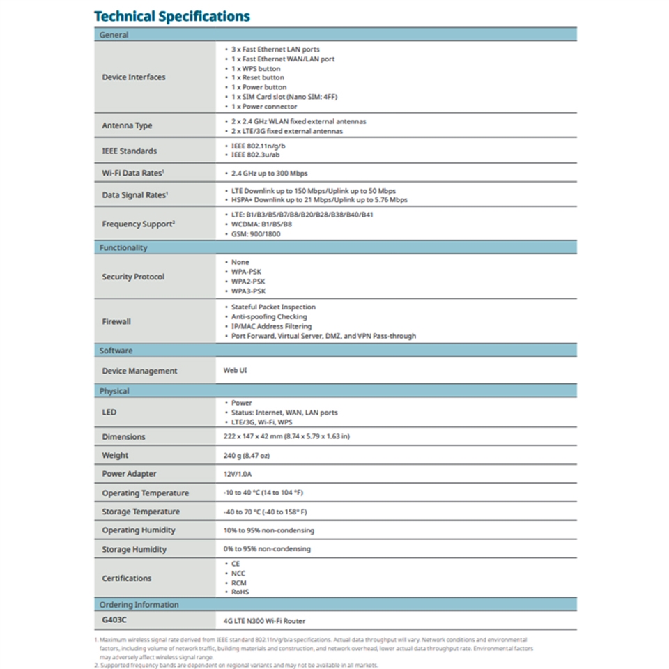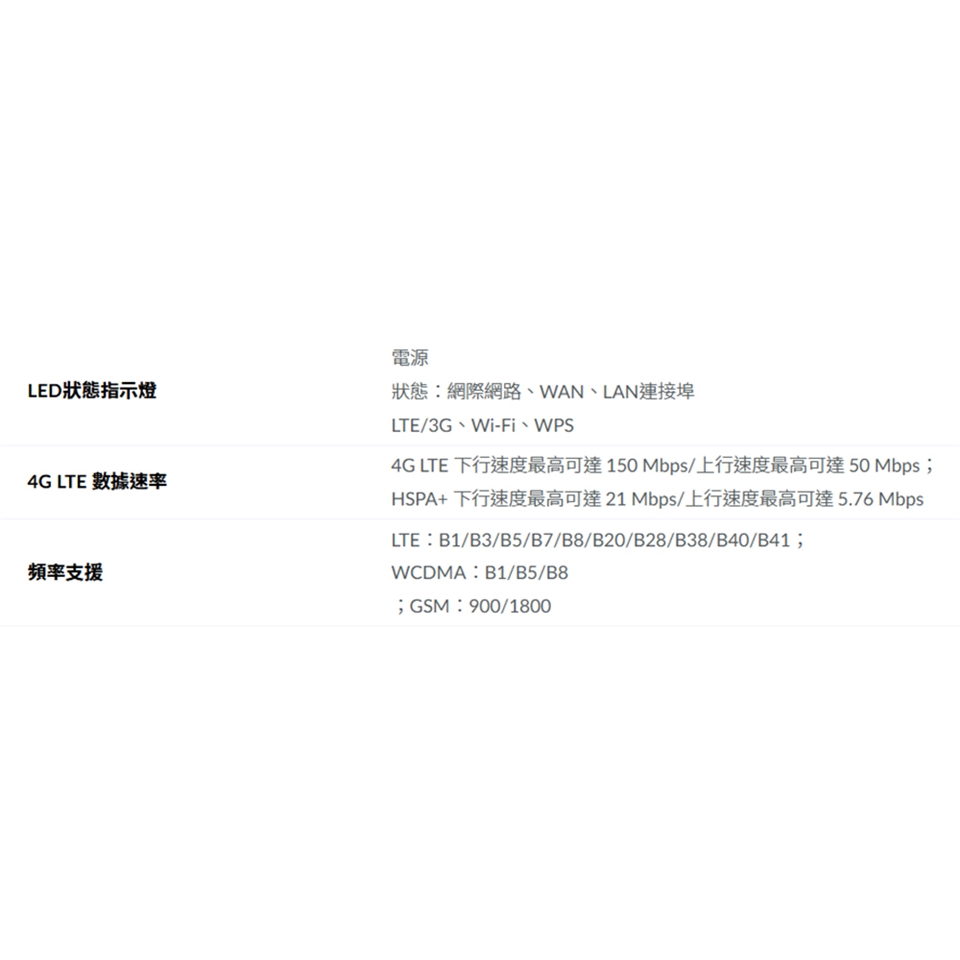 -4G LTE連線 : 支援4G LTE Cat 4下行速度高達150 Mbps,上行速度高達50Mbps。
