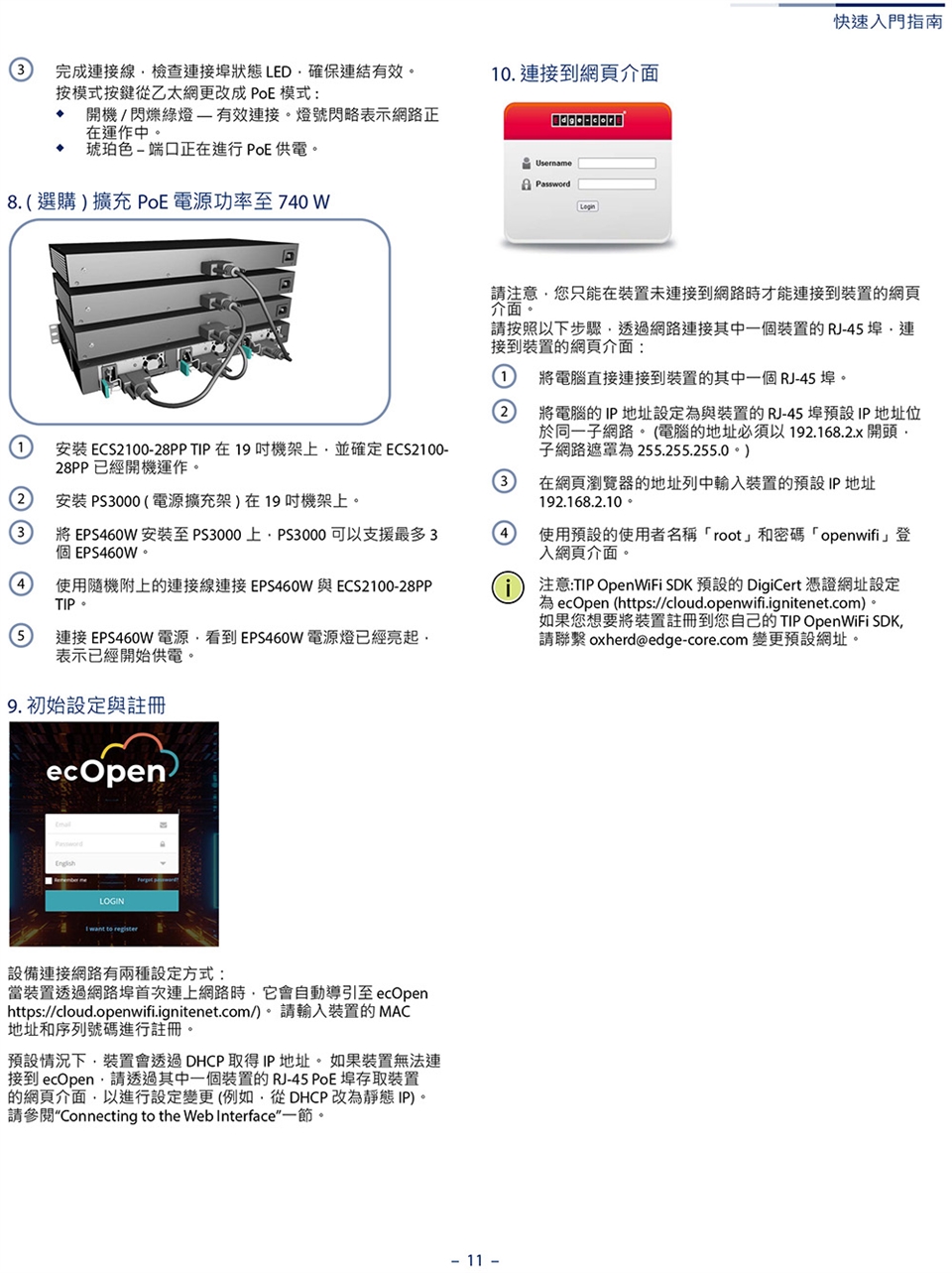 *支援PoE供電 - ECS2100-28PP可提供每埠30瓦的功率至相關連接設備,如:網路電話、無線網路基地台、安防監控攝影機等,充分利用現有的乙太網路電纜的基礎設施。ECS2100-28PP搭配PS3000(機架式電源)和EPS460W(擴充式電源供應器)時,供電量可提升到740W,24埠每埠30瓦的功
