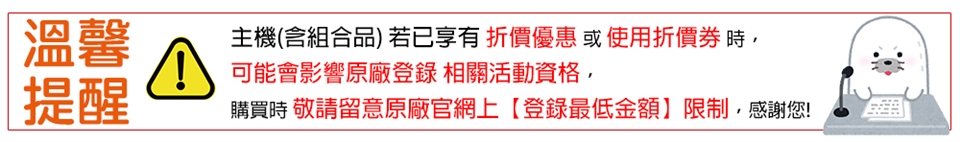 ★請注意:機+帶組合價低於最低登錄金額時,即不再適用原廠登錄送贈品+升級保固活動,下單前請留意,謝謝。