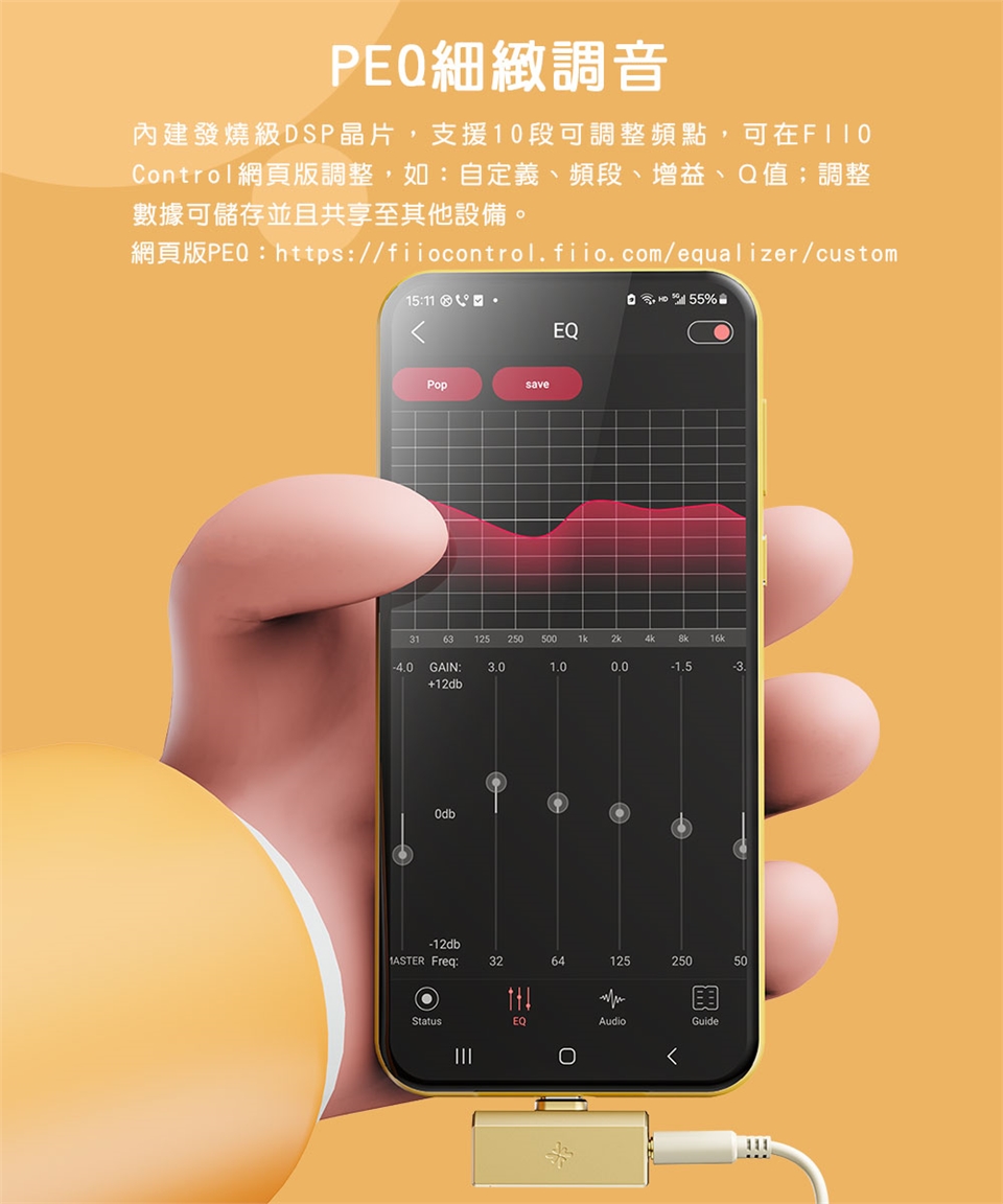 內建發燒級DSP晶片,支援10段可調整頻點,可在網頁版 PEQ調整,如:自定義、頻段、增益、Q值;調整數據可儲存並且共享至其他設備。