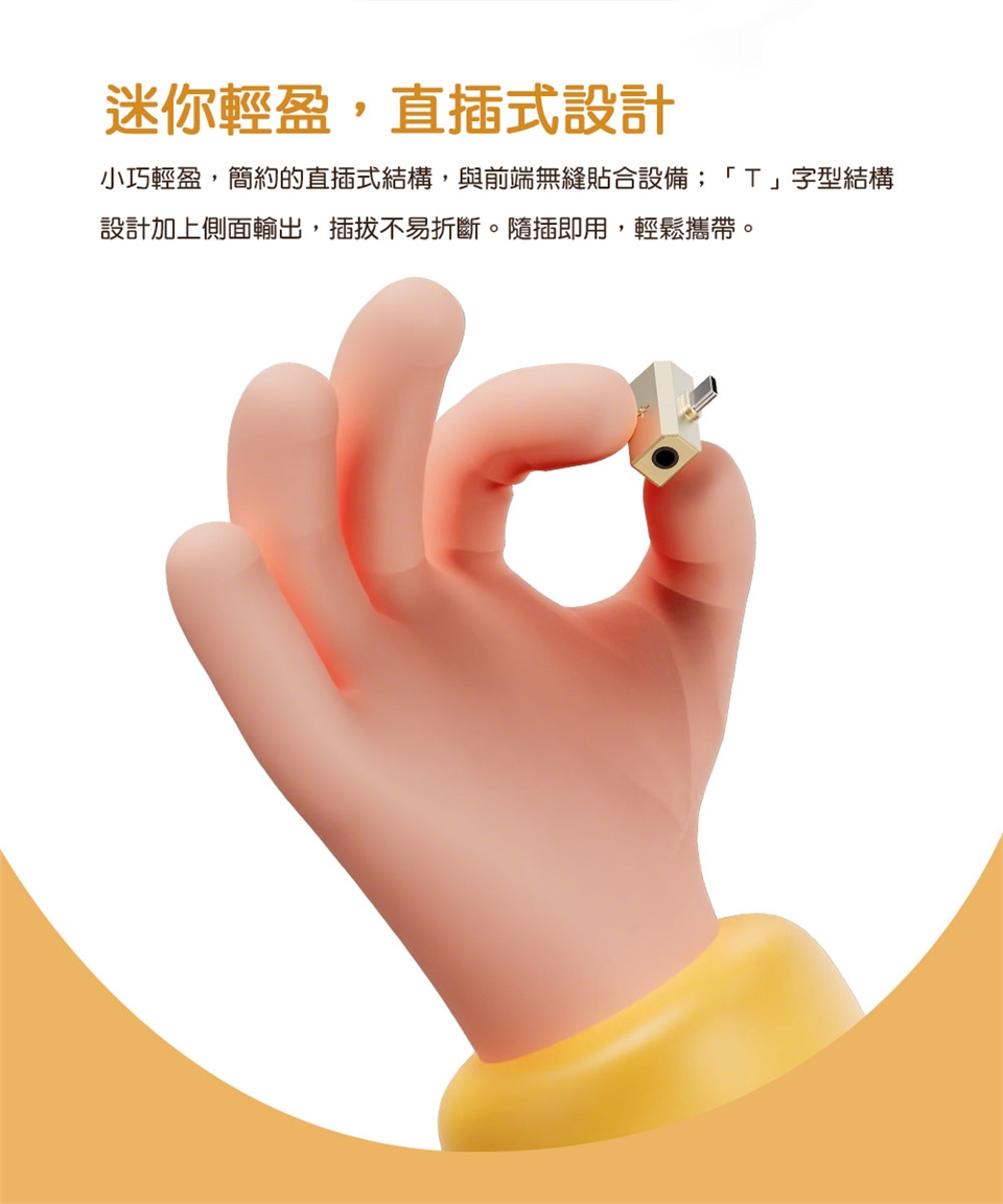 小巧輕盈,簡約的直插式結構,與前端無縫貼合設備;「T」字型結構設計加上側面輸出,插拔不易折斷。隨插即用,輕鬆攜帶。