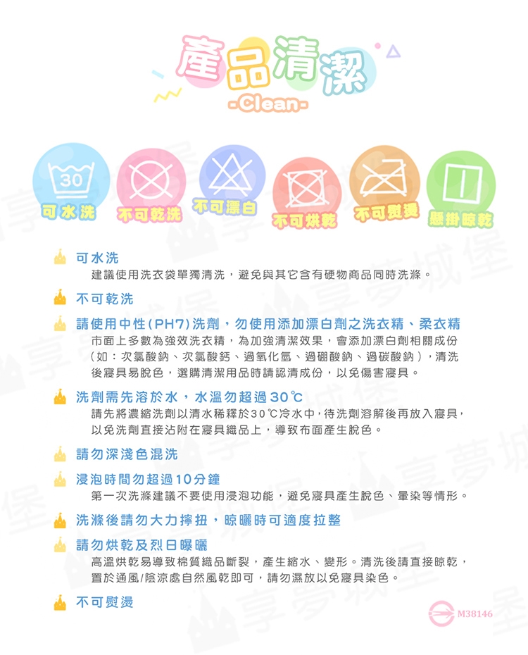 .請使用中性(PH7)洗劑,勿使用添加漂白劑之洗衣精、柔衣精。