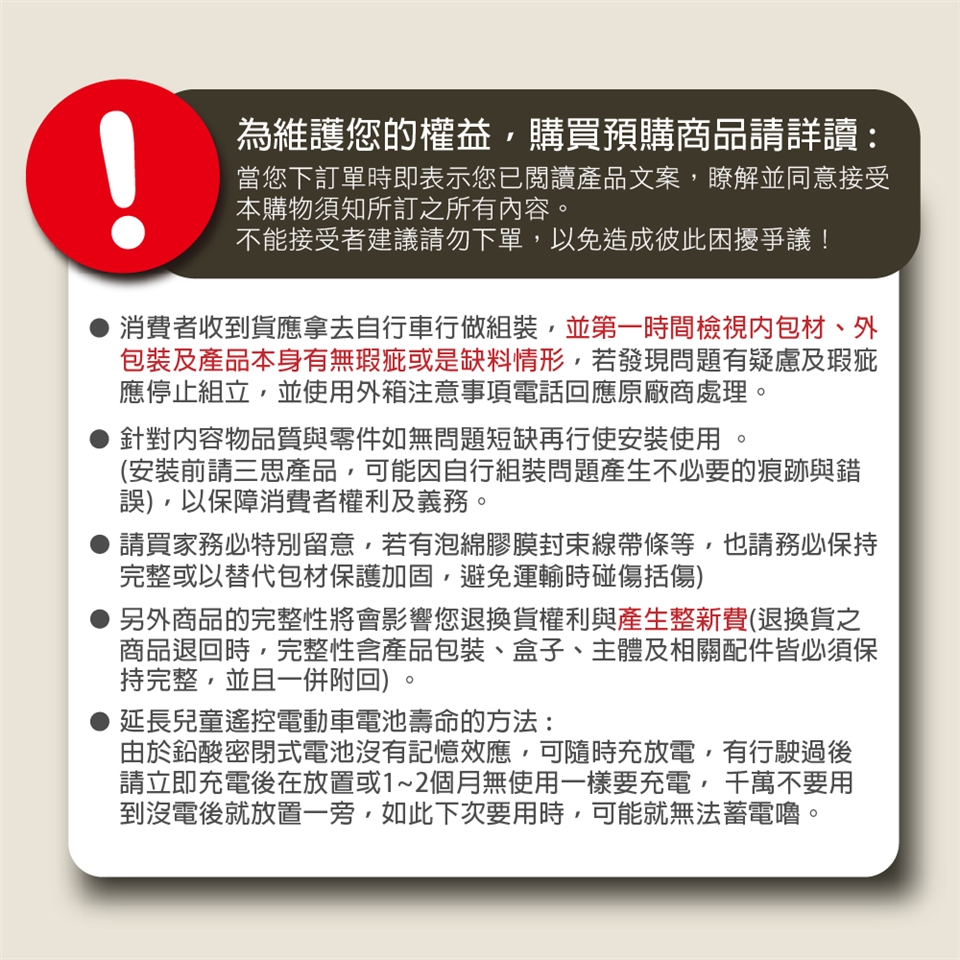 *請注意鑑賞期非試用期,若收到商品經檢察時發現有瑕疵或有任何疑慮時請勿騎乘使用。