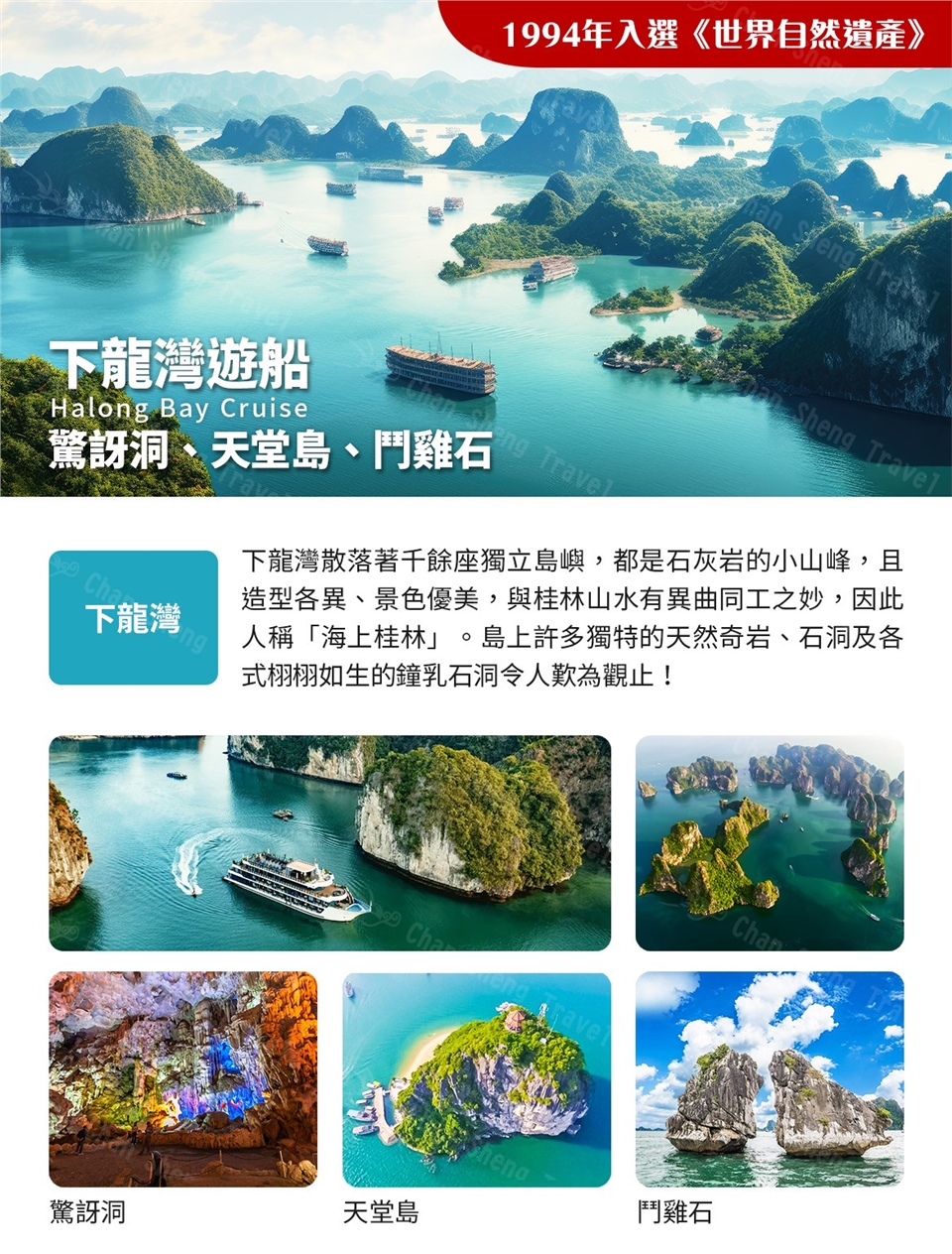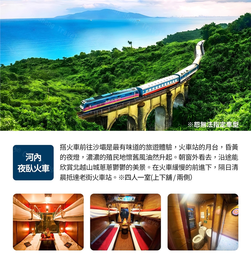 【下龍灣VIP遊船《驚訝洞、天堂島(TITOP島)、鬥雞石》】今日出海遊覽下龍灣的天然奇景,聯合國教科文組織於1994年將下龍灣列入世界遺產目錄。由於下龍灣的小島都是石灰岩的小山峰,且造型各異、景色優美,與桂林山水有異曲同工之妙,因此曾到過這裏旅遊的客人都親切地稱下龍灣為「海上桂林」。下龍灣在海面上,散落著千餘座獨立島嶼,這些小島亦有龍島、猴島、龜島、蟾島、鬥雞島…等別名,島上許多獨特的天然奇岩、石洞及各式栩栩如生的鐘乳石洞令人歎為觀止! 【觀光夜臥火車~河內夜臥列車】晚餐後前往一般酒店內梳洗,盥洗後前往河內火車站,火車站的月台,昏黃的夜燈,濃濃的殖民地懷舊風油然升起。 早餐:酒店內早餐 午餐:船上用餐(每人一隻季節性螃蟹) 晚餐:悅來順越式風味 |