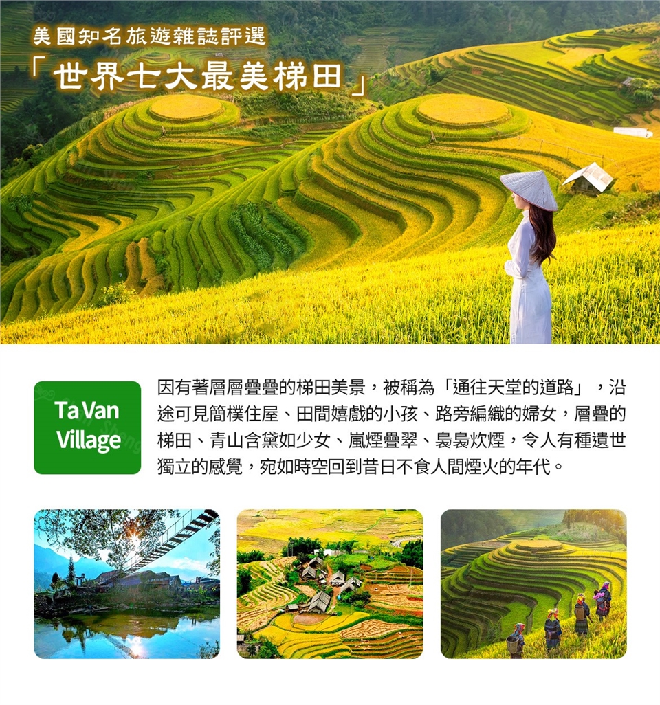 【龍雲玻璃橋】山裡的古樸,竟與現實交錯,越南三座玻璃天空橋之一的龍雲玻璃橋位於海拔2200多公尺,包括300公尺高的透明玻璃電梯,全橋長500公尺,一段伸出懸崖60公尺,無一不在挑戰八方來客的膽量。 早餐:飯店享用 午餐:山城風味餐(含酒水) 晚餐:越南 山地特產風味合菜(含可樂或啤酒一瓶) |