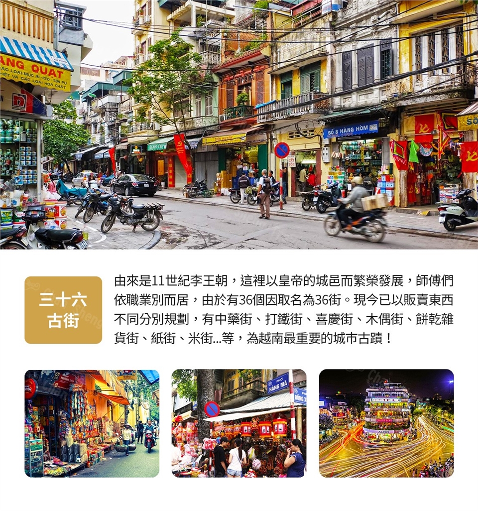 【三十六古街《含電瓶車遊.小費自理》】河內最古老的商業區,位於還劍湖北邊佔地寬闊的老街區,在11世紀李王朝的時代,這裡以皇帝的城邑而繁榮發展,據說古代只有36種行業,每種行業一條街,繁華熱鬧、映照出當年昇龍京城的興旺,現今受到各國旅客的喜愛,是每到河內一定必遊的地方。 早餐:飯店享用 午餐:越式風味餐 晚餐:XXX |