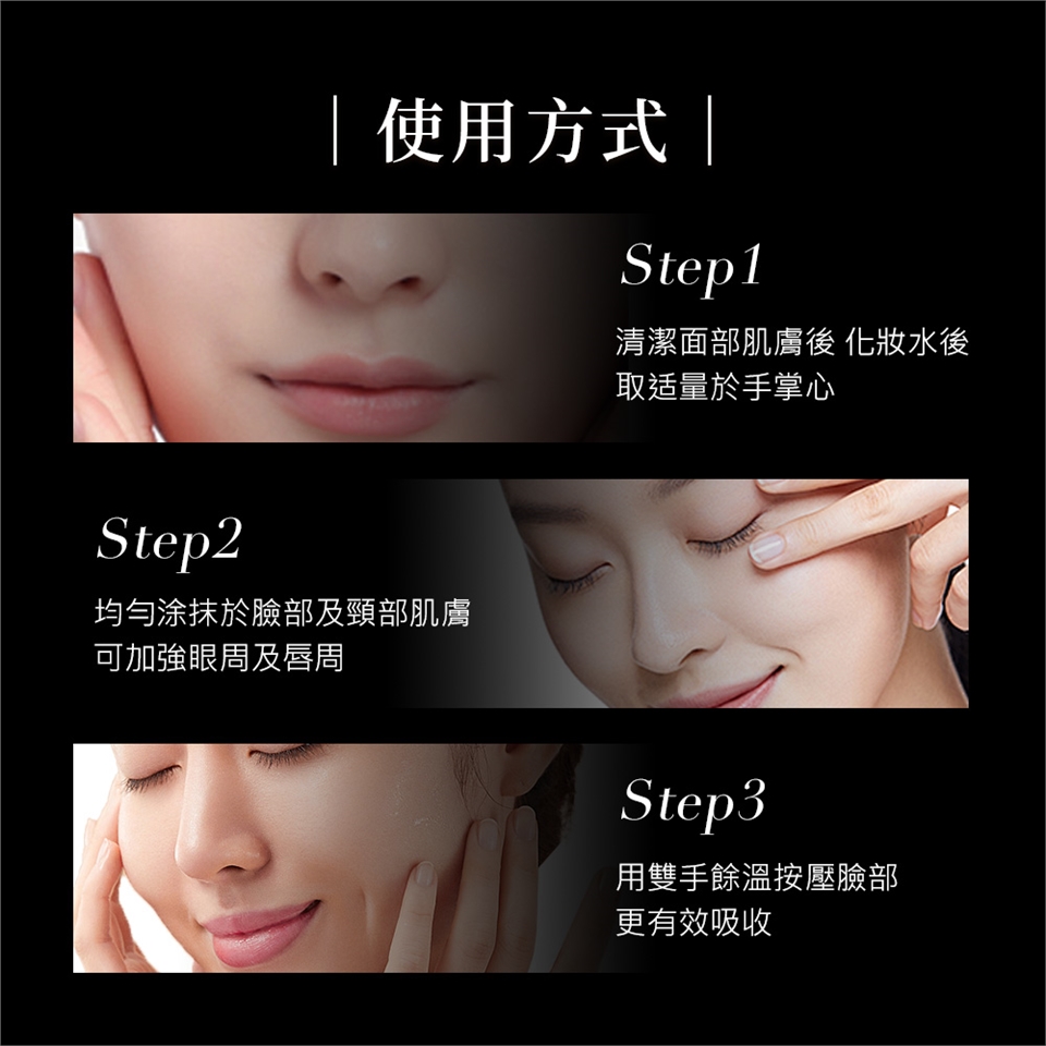 每日早晚使用,臉部洗淨後請取適量塗抹於眼部,臉部及頸部肌膚,可加強眼周及唇周,充分滋潤肌膚。