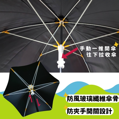 1.開傘前請左右搖擺,甩開傘布與傘骨後,按下開關才可避免傘布糾結傘骨產生斷裂或損壞。
