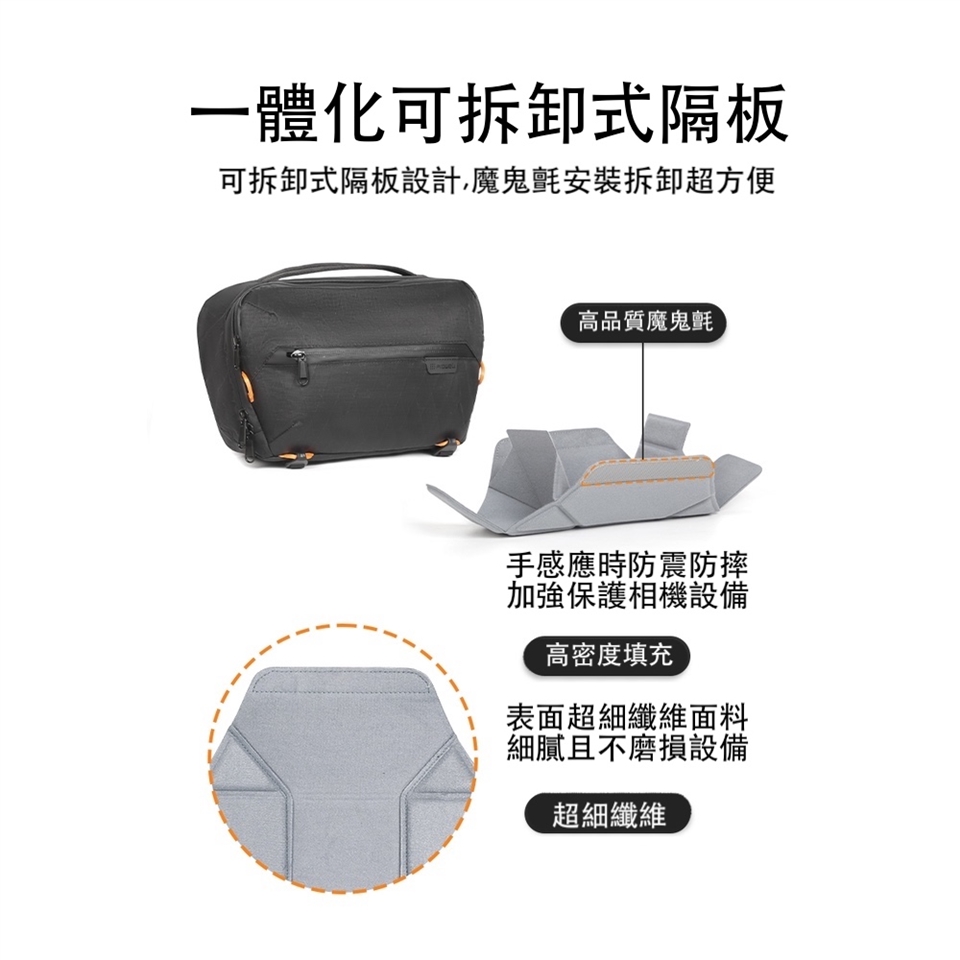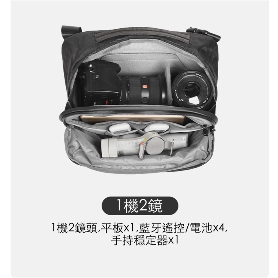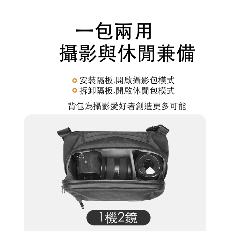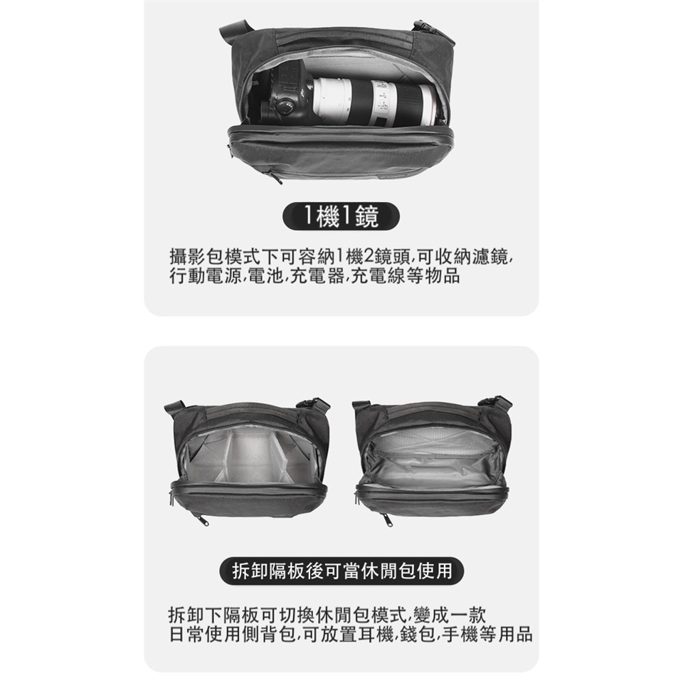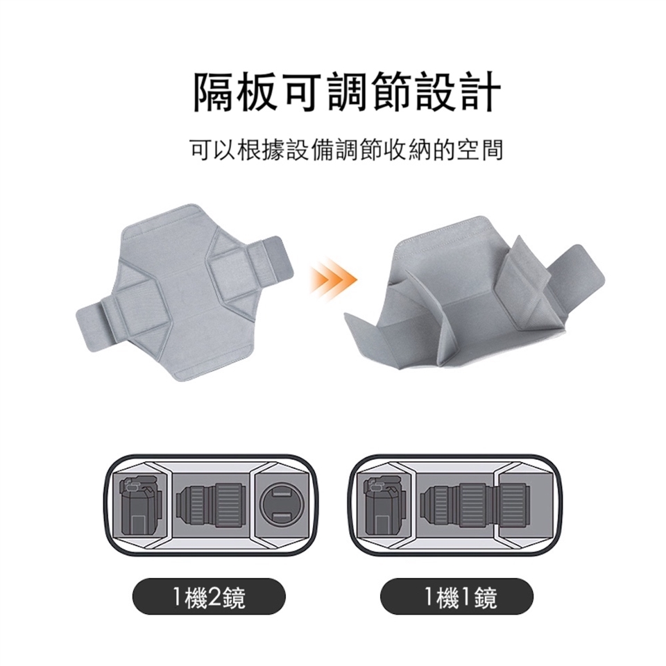 貼心收納,靈活多變: 可調節隔板設計,可根據您的攝影器材(如:1機2鏡或1機1鏡)自由調整收納空間 內襯採用尼龍內裡,提供器材柔軟保護