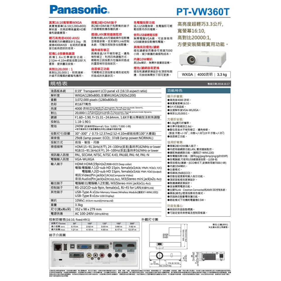 PT-VW360T (WXGA 1280x800)採用高畫質真實寬螢幕,高畫質投影使影像不失真畫面更生動。簡潔大方的機體設計,擁有輕巧的機身僅3.3kg,亮度達 4000 ANSI,在明亮的會議室也能有很好的表現!