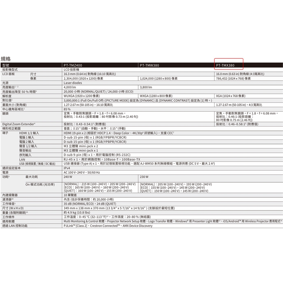 可從73cm(2.40ft)處投影80吋的影像並可避免陰影遮擋畫面。 輕巧的4.9kg(10.8lbs)機體不僅方便攜帶,更因具備Digital Zoom Extender 和 Image Shift 功能而易於安裝。隨時立即展開工作: 從待機狀態到開始投影只需約一秒鐘,而24dB的低噪音操作更能 讓人保持專注。
