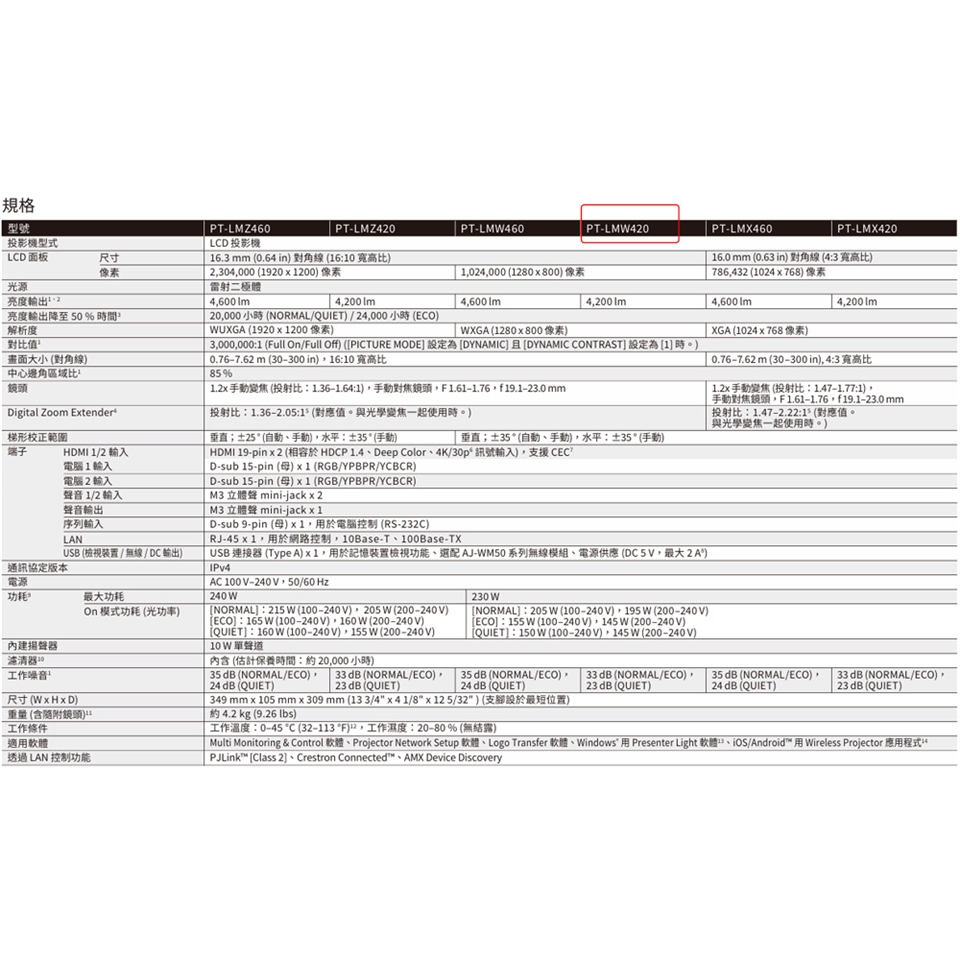 LMZ460 系列重量僅 4.2 kg (9.26 lbs) 並具有小巧機體方便 攜帶及安裝。從待機狀態到開始內容投影僅需約一秒鐘,透 過CEC指令相容HDMI®與投影來源進行連結控制,並採用新 的Digital Zoom Extender 與 Image Shift 功能實現靈活的 安裝。