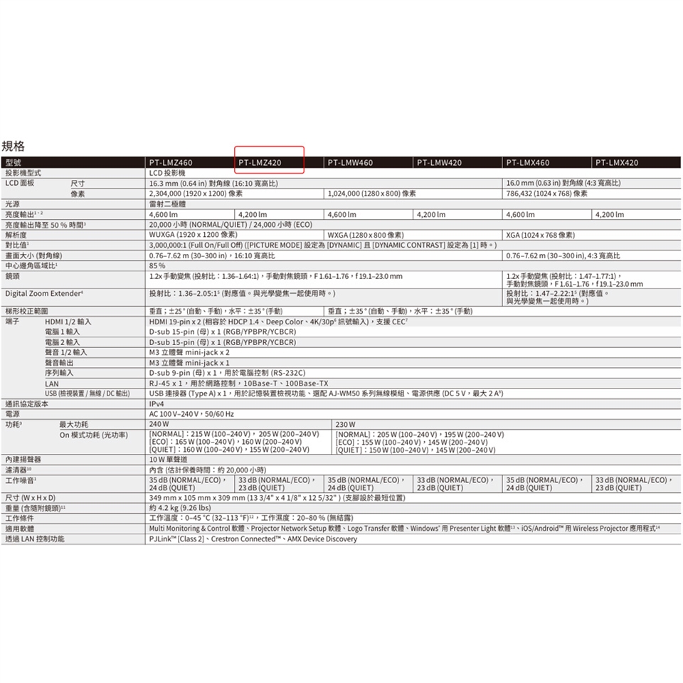 LMZ420 系列重量僅 4.2 kg (9.26 lbs) 並具有小巧機體方便 攜帶及安裝。從待機狀態到開始內容投影僅需約一秒鐘,透 過CEC指令相容 HDMI® 與投影來源進行連結控制,並採用新 的Digital Zoom Extender 與 Image Shift 功能實現靈活的 安裝。