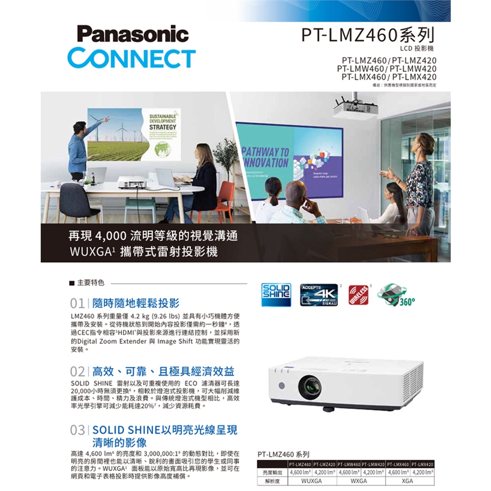 LMZ460系列非常便於攜帶且容易安裝。它可提供高達 4,600 lm 的亮度 ,即使在明亮的房間內仍可呈現生動的 畫面。而 3,000,000:1 的動態對比和 WUXGA 的解析度, 更能呈現清爽流暢的文字。從待機狀態到開始投影只需約 一秒鐘,而 23dB的低噪音操作更能減少干擾。