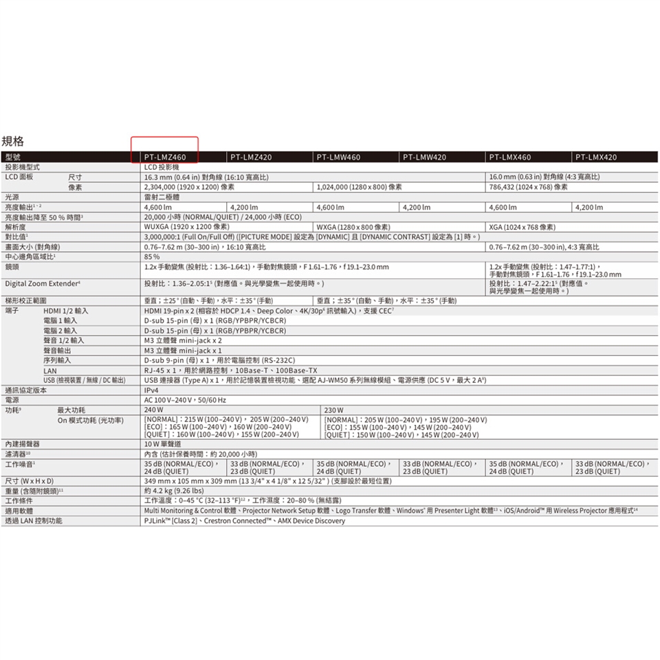LMZ460 系列重量僅 4.2kg (9.26lbs) 並具有小巧機體方便 攜帶及安裝。從待機狀態到開始內容投影僅需約一秒鐘,透 過CEC指令相容HDMI®與投影來源進行連結控制,並採用新 的Digital Zoom Extender 與 Image Shift 功能實現靈活的 安裝。