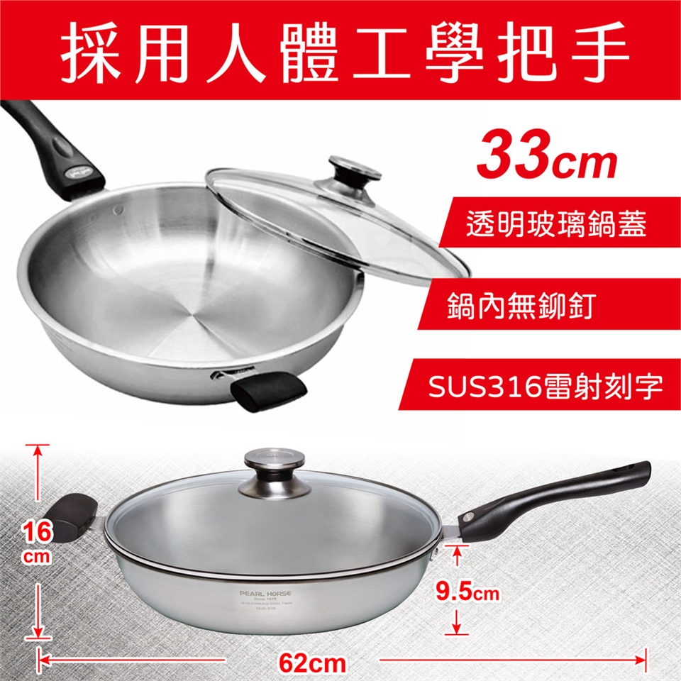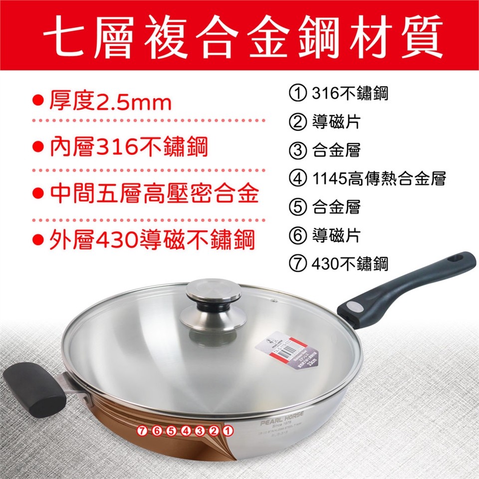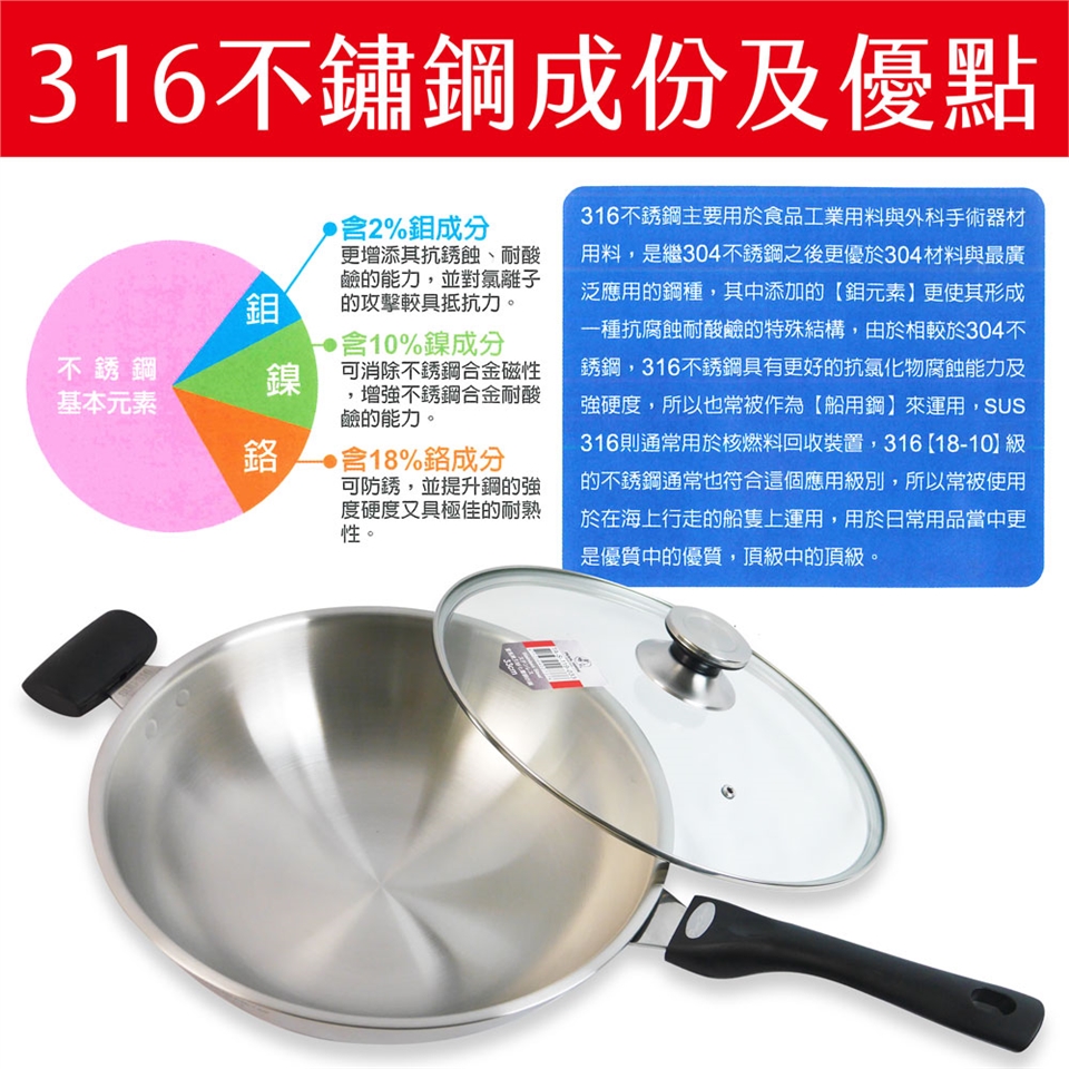 商品材質:內層316不鏽鋼,中間五層高壓密合合金,外層430不鏽鋼,鍋蓋透明強化玻璃